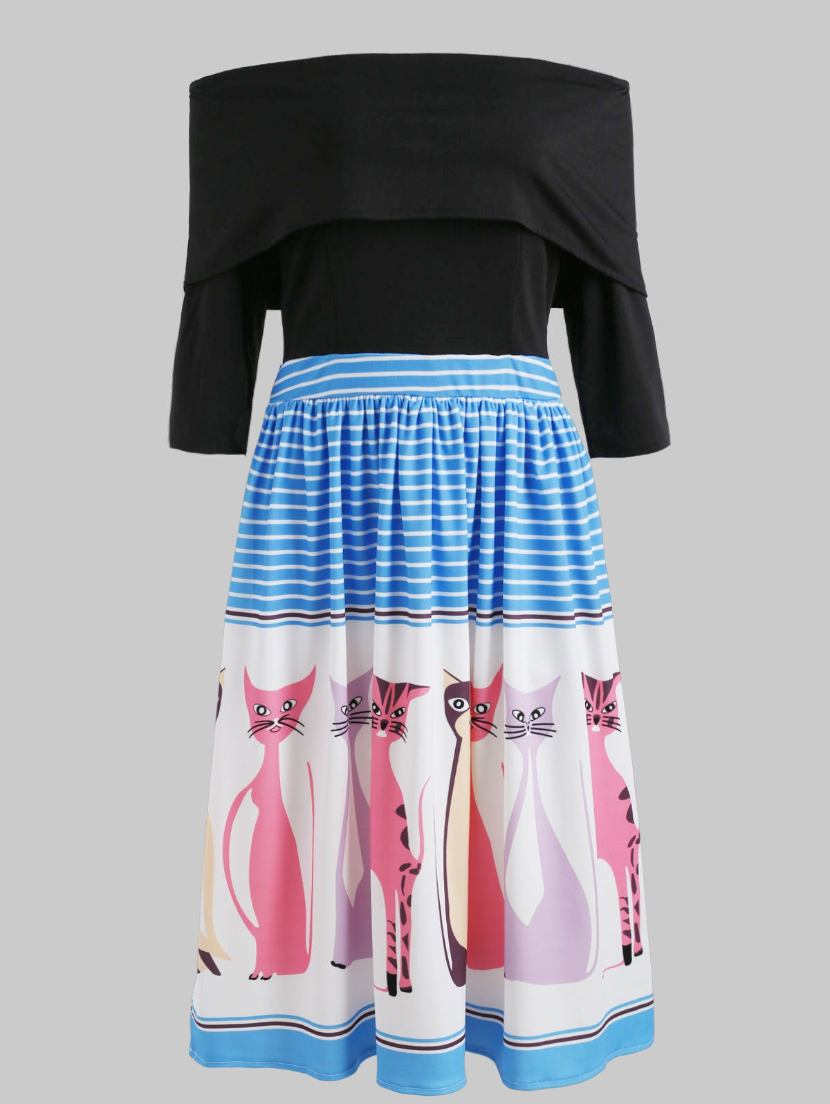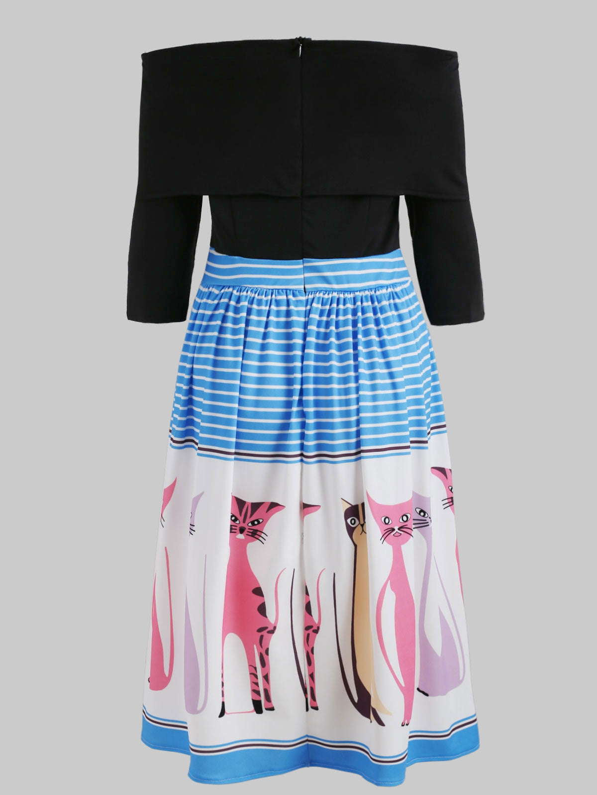 Vintage-style dress features an alluring off-the-shoulder neck with a ruffled overlay, 3/4 length sleeves, and concealed back zipper at bodice, while the skirt is full of cute stripes and cats print for added appeal. Wide waist design which shows off your slim figure perfectly. It is perfect for daily, ball, party, banquet and other special occasions.