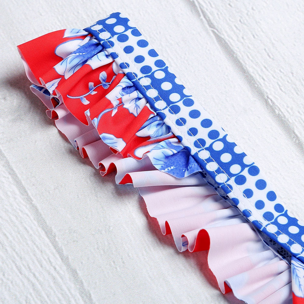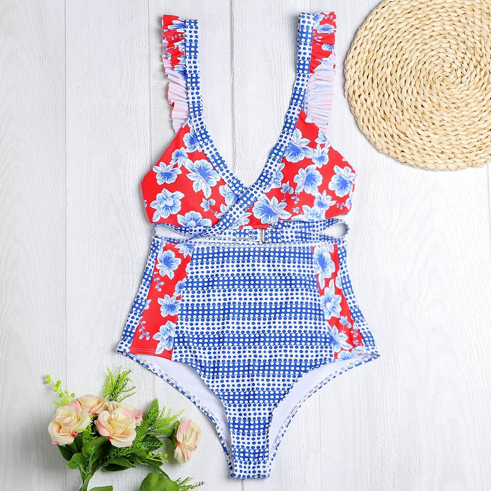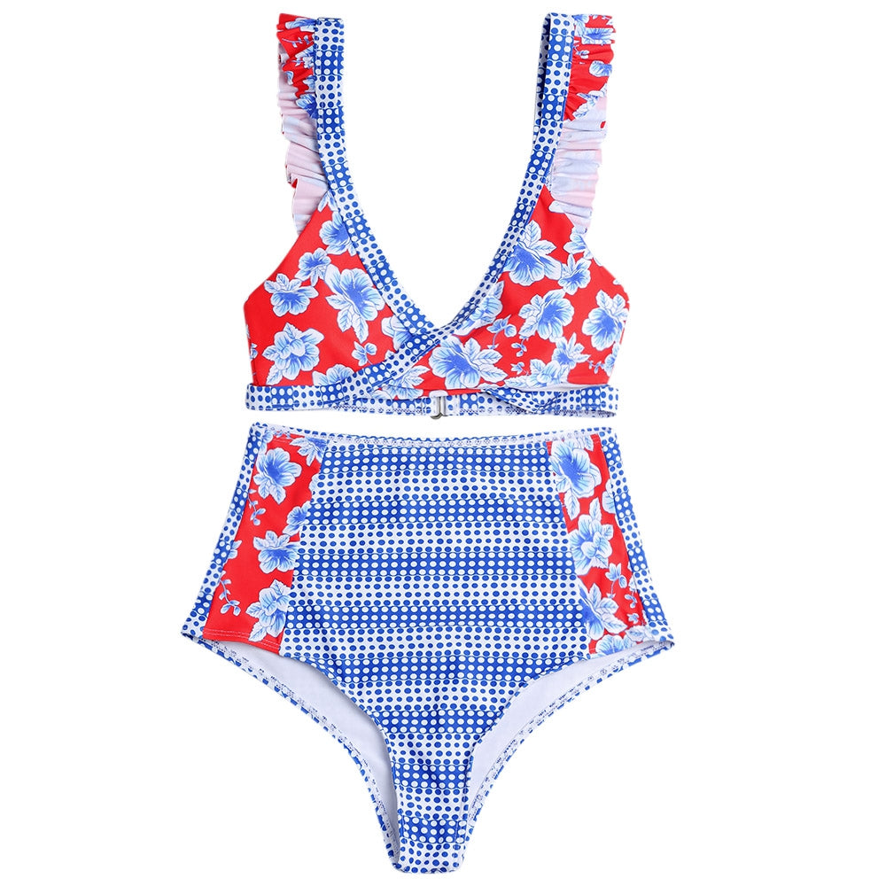 Plunge Neck Criss-cross Padded Ruffle Floral Print High Waist Women Bikini Set