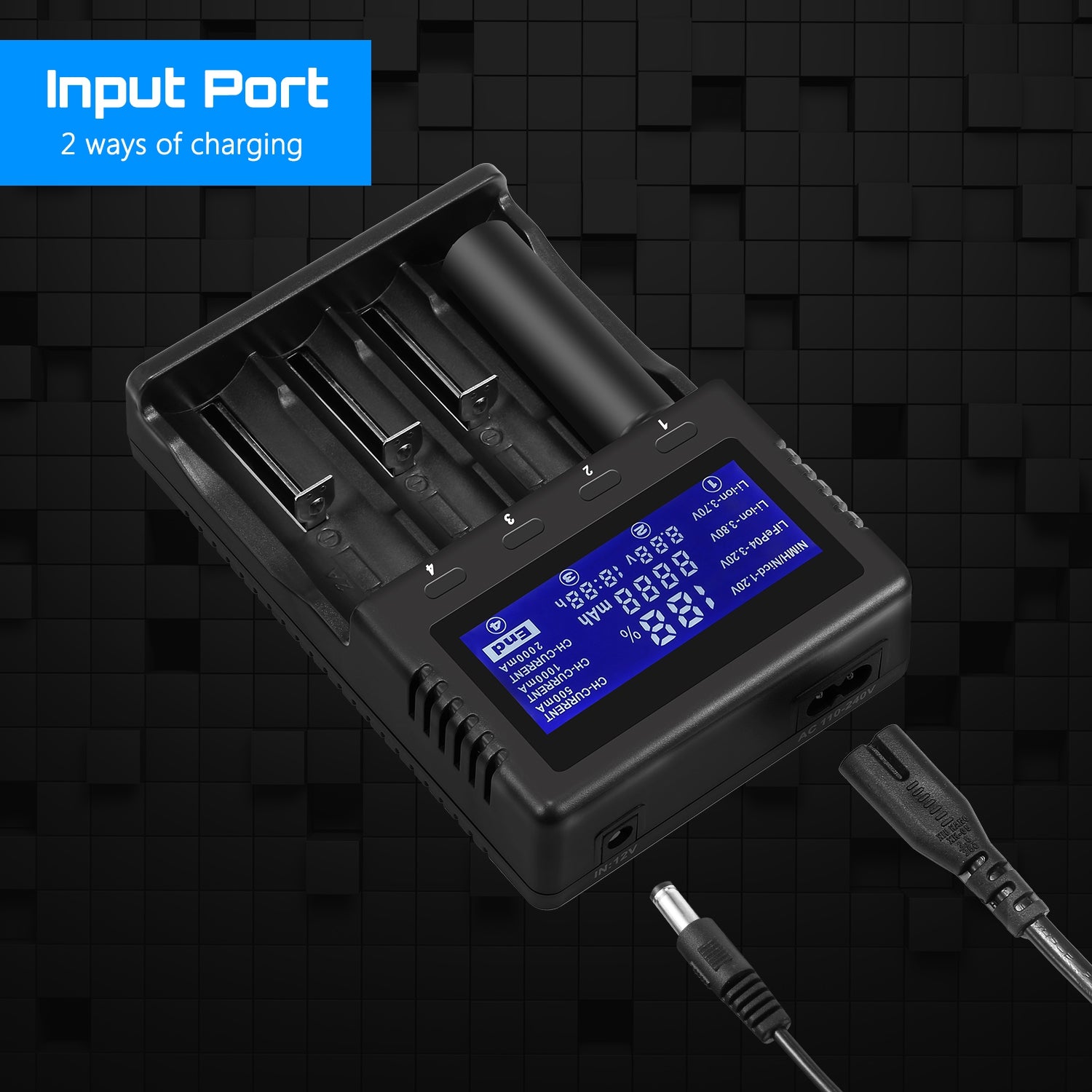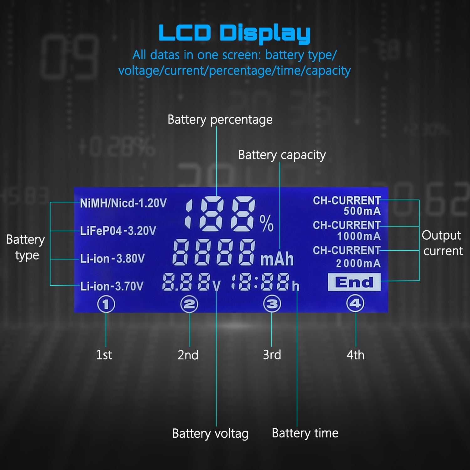 - LED indicator light design: it can display the state of charge 25 percent, 50 percent, 75 percent, 100 percent; also display the battery type NiMH 1.2V, Li-Fe 3.2V, Li-ion 3.7V, Li-ion 3.80V (IMR)