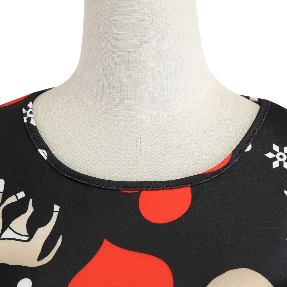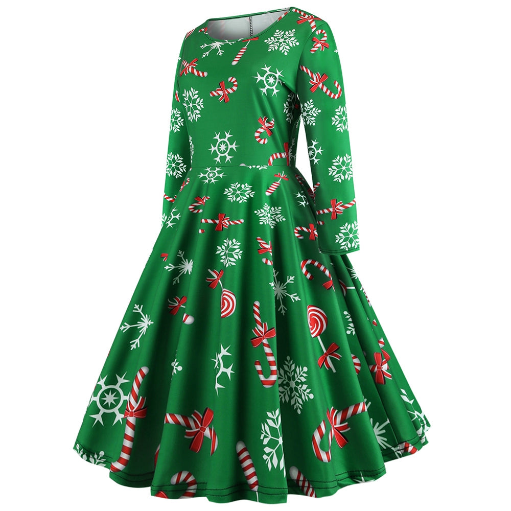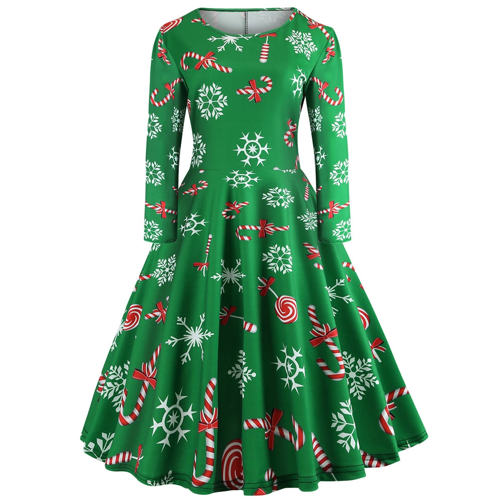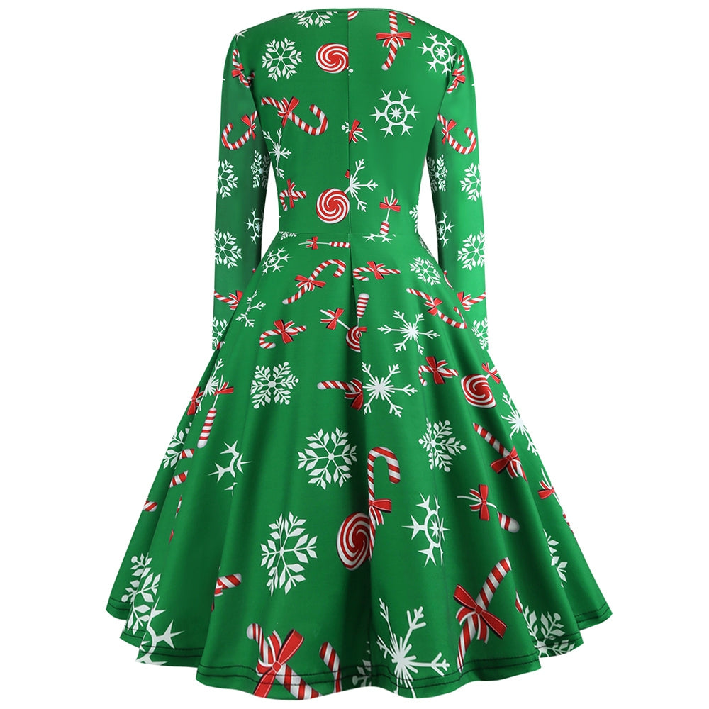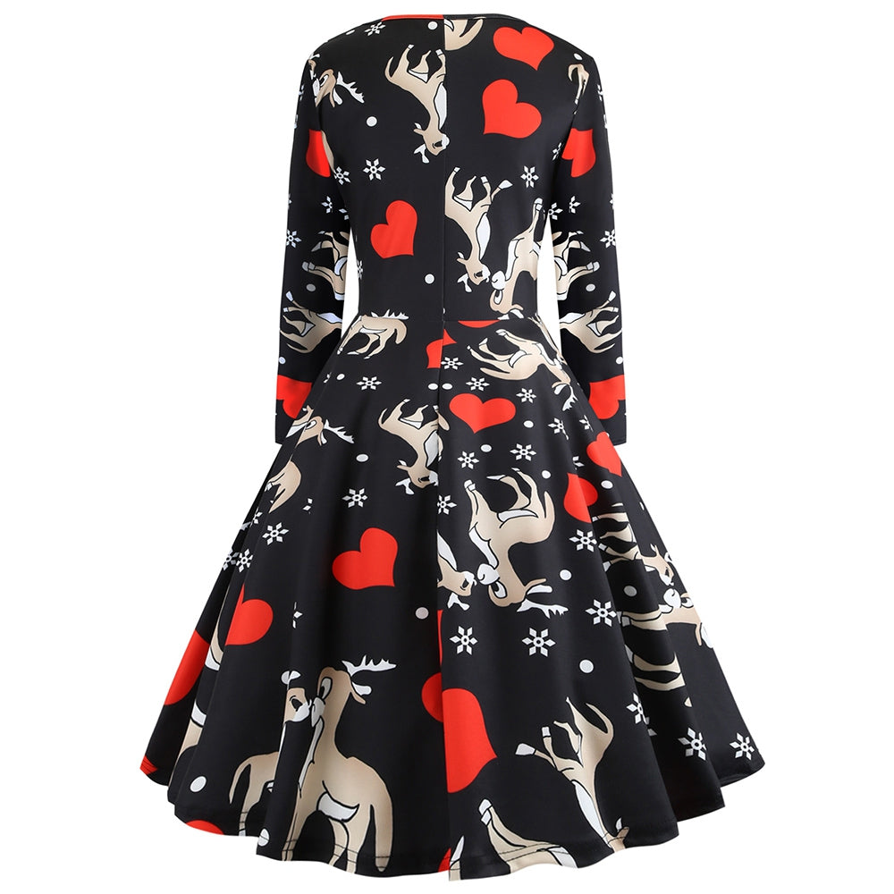 Vintage Round Collar Long Sleeve Christmas Print Women A Line Dress