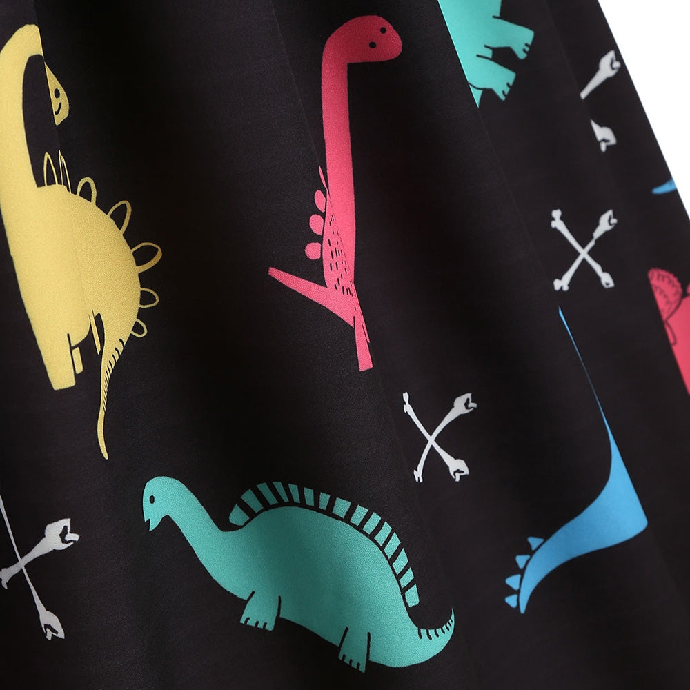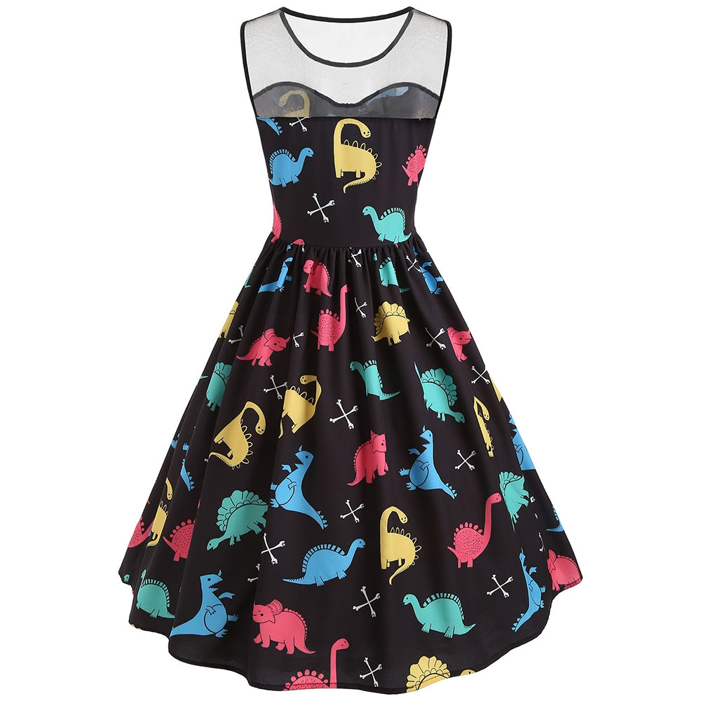 Mesh Insert Cartoon Dinosaur Print Vintage Dress