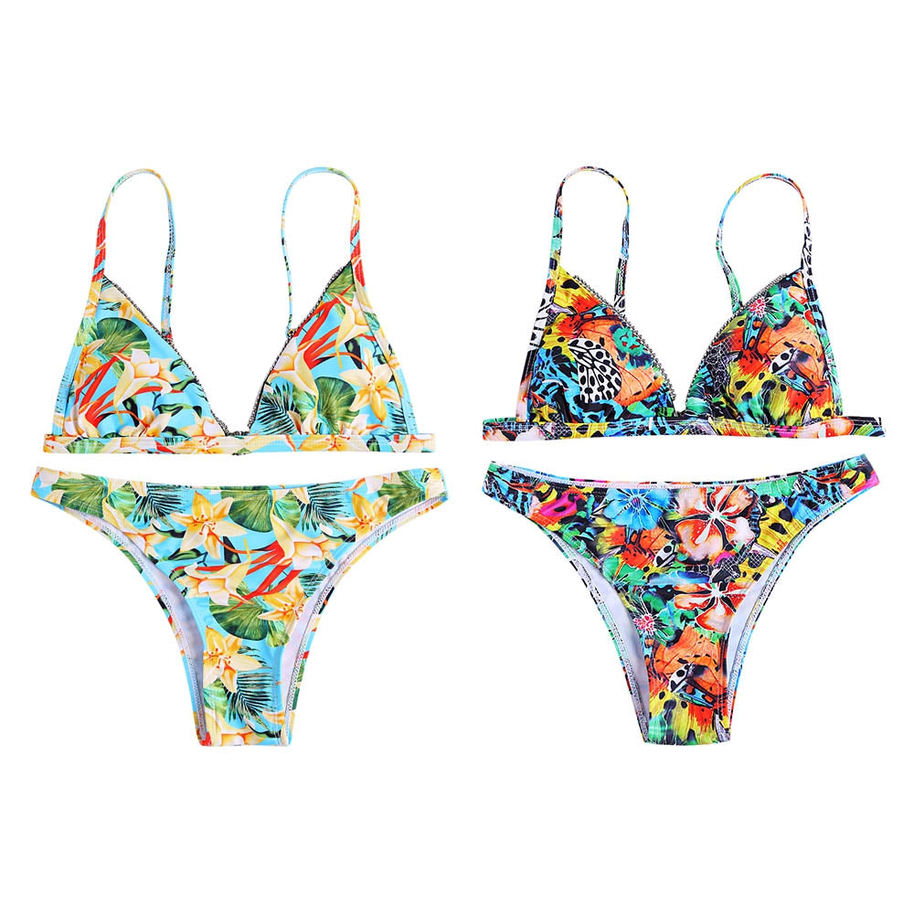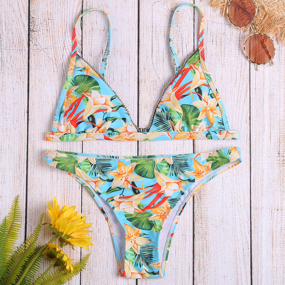Spaghetti Strap Padded Floral Print Beaded Low Waist Women Bikini Set