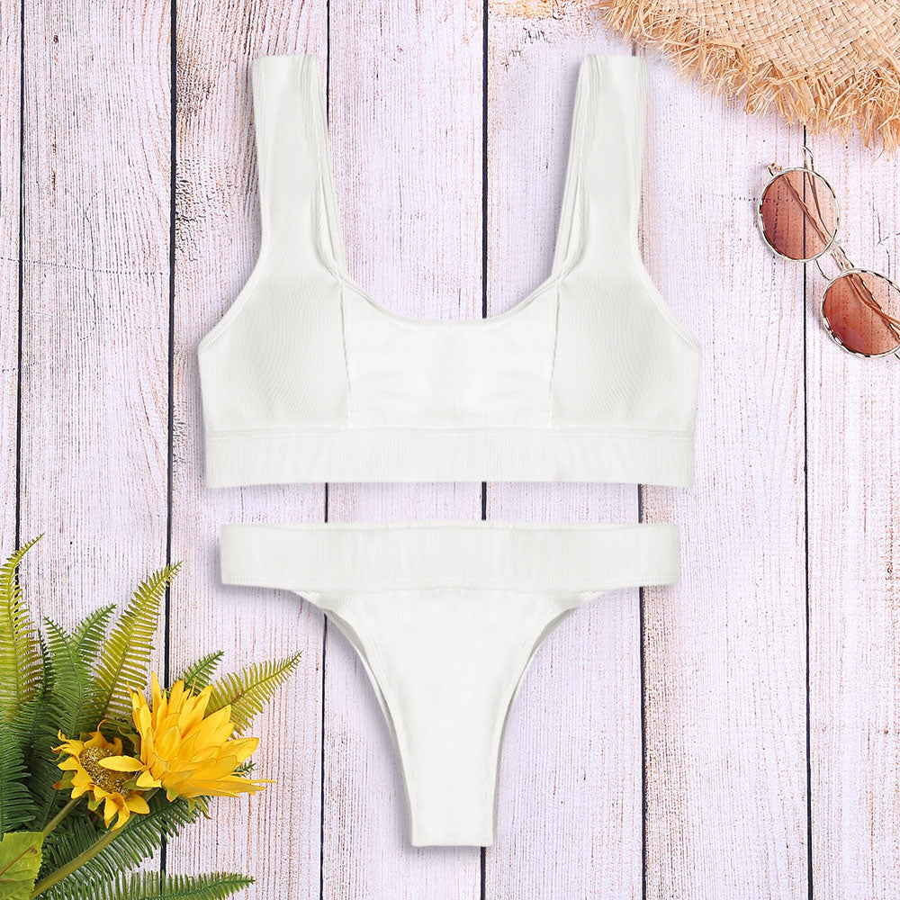 Scoop Neck Backless Padded Ribbed Solid Color Low Waist Women Bikini Set