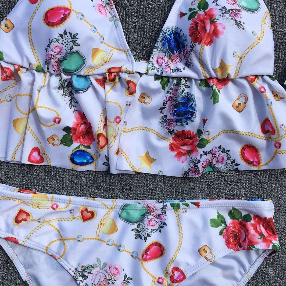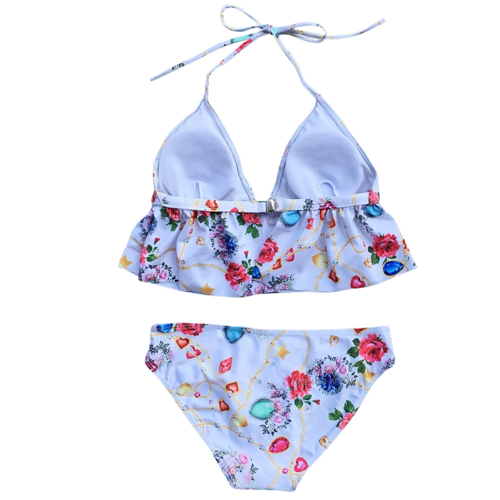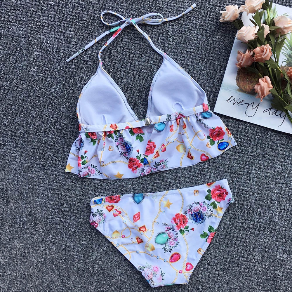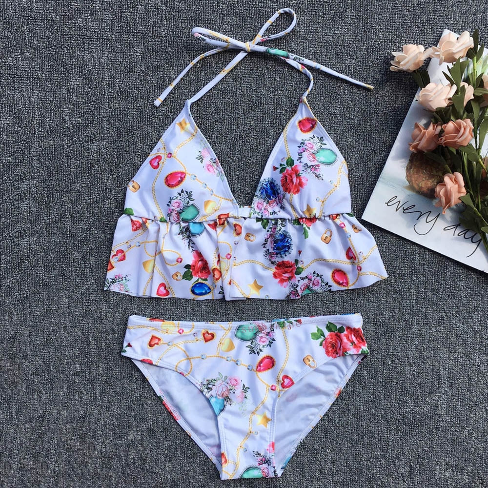 Halter Neck Backless Padded Print Ruffle Low Waist Women Bikini Set