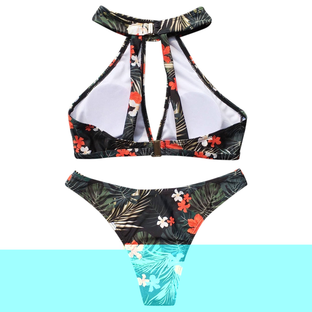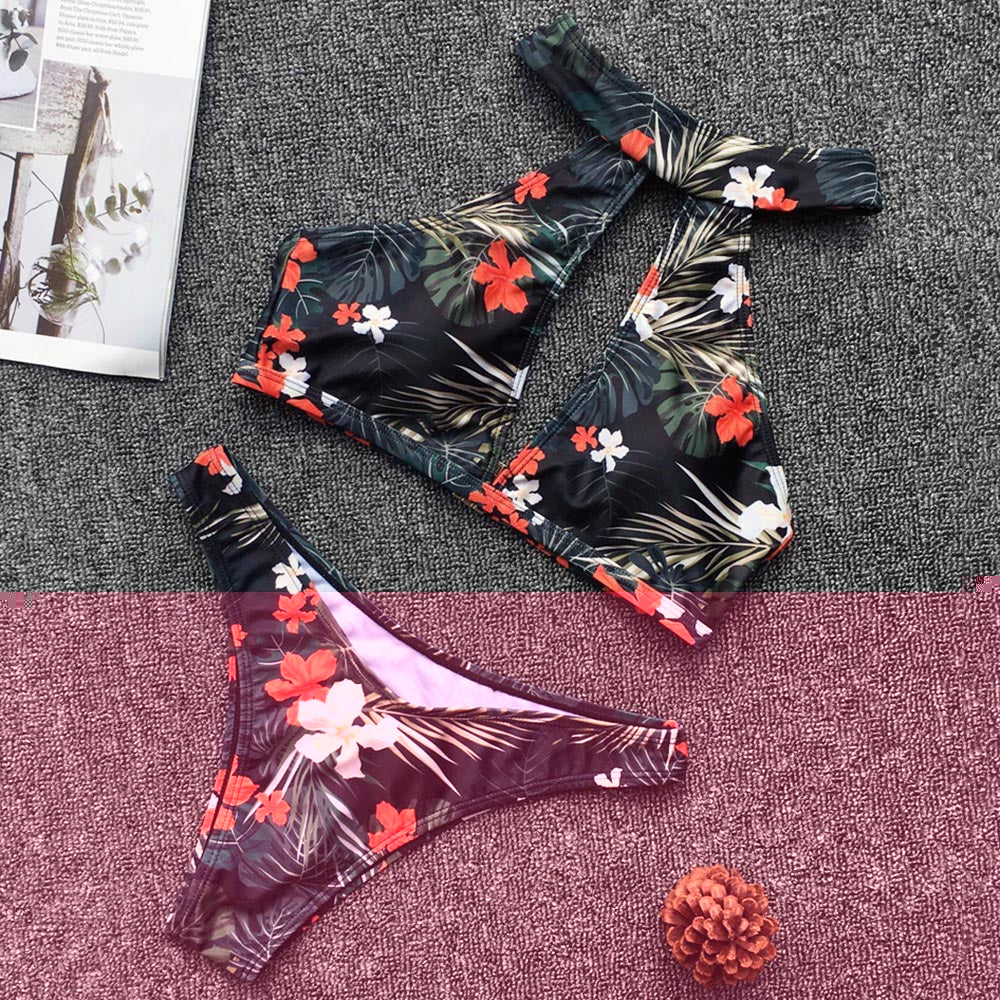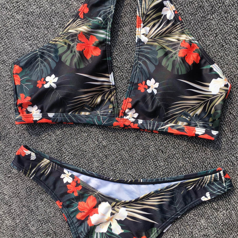 Halter Neck Backless Padded Floral Print Low Waist Women Bikini Set