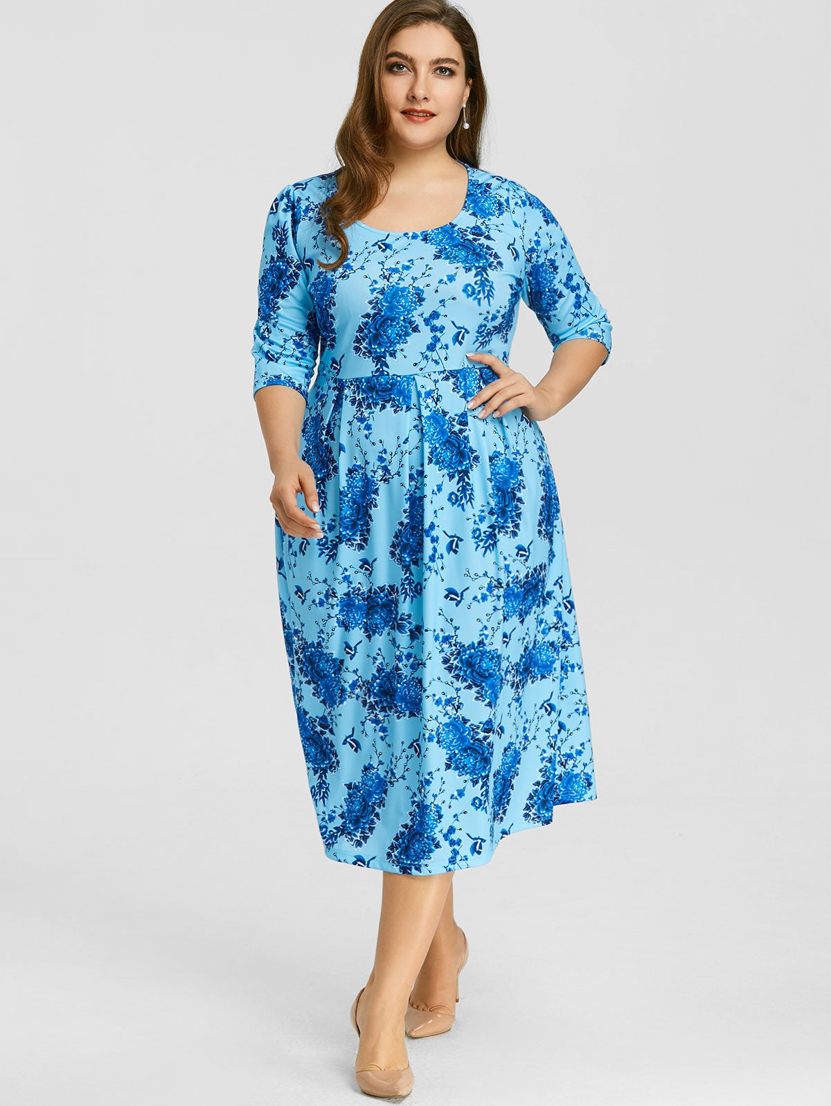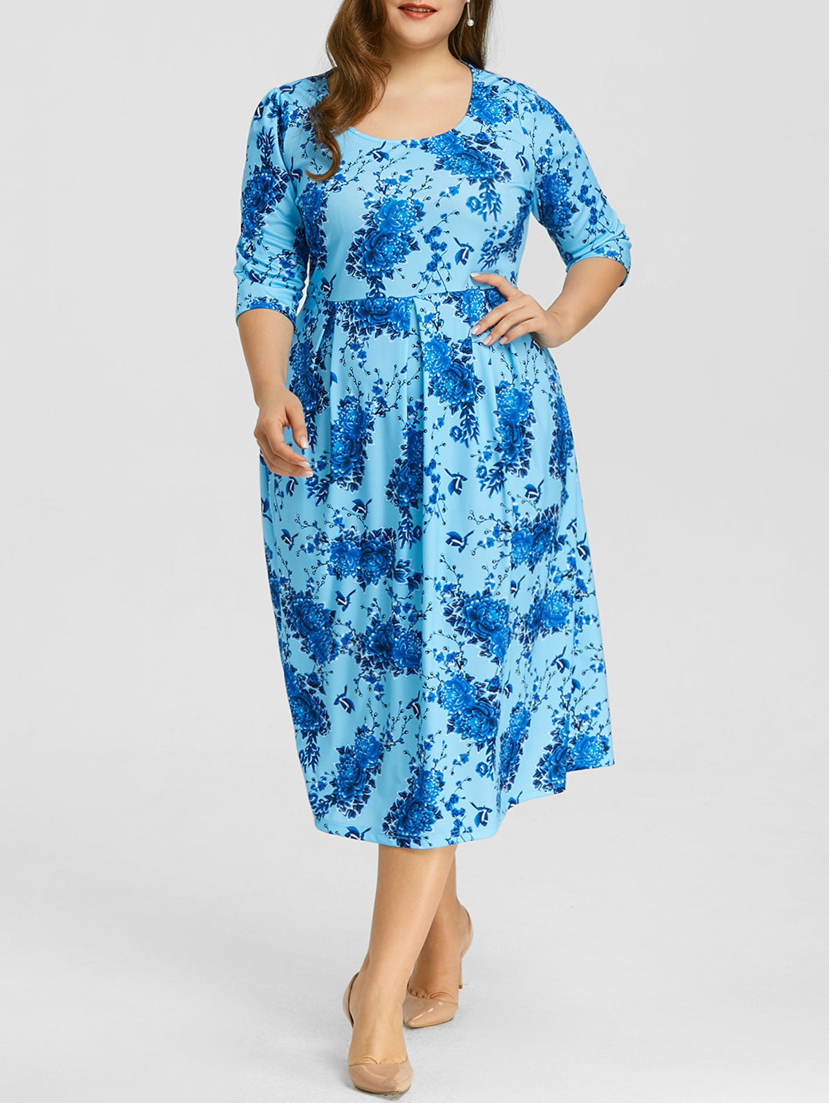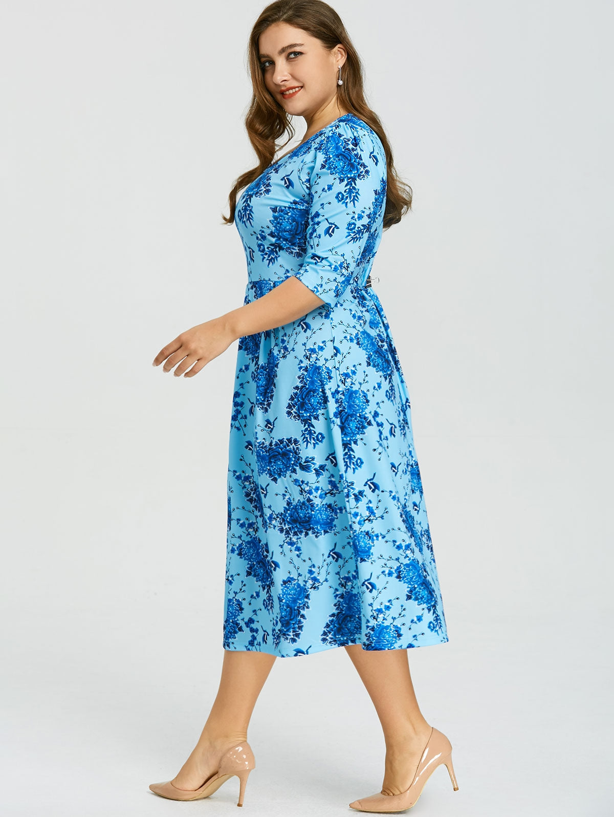 Spruce up your warm-weather wardrobe with this pretty floral dress. Colorful blossoms adorn this pretty floral dress, adding a fresh pop to your wardrobe. The dress has a round neck, three-quarter sleeve, and mid-calf length for an A-Line silhouette.