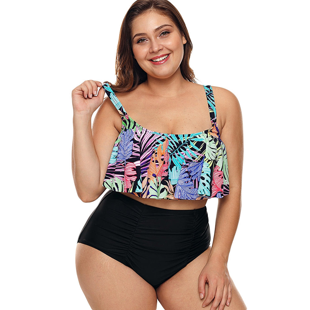 The colorful leaf print of this feminine bikini set continues the dreamy visions of time spent in the sand. Featuring a spaghetti strap with ruffle trim surround the chest. Pair with the solid color swim briefs will attach everyone's attention.