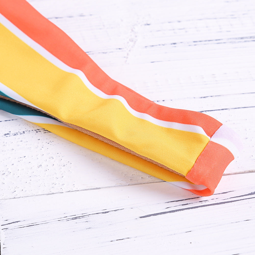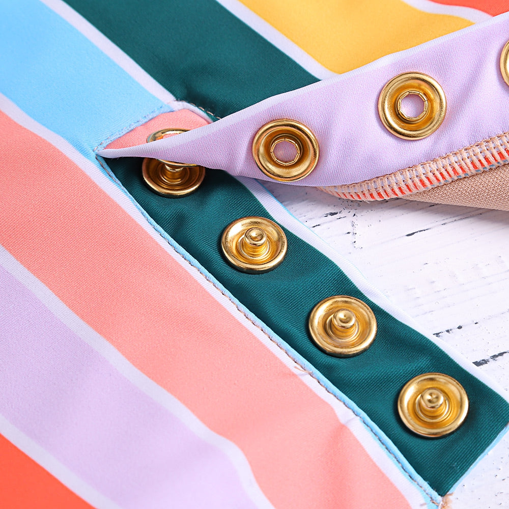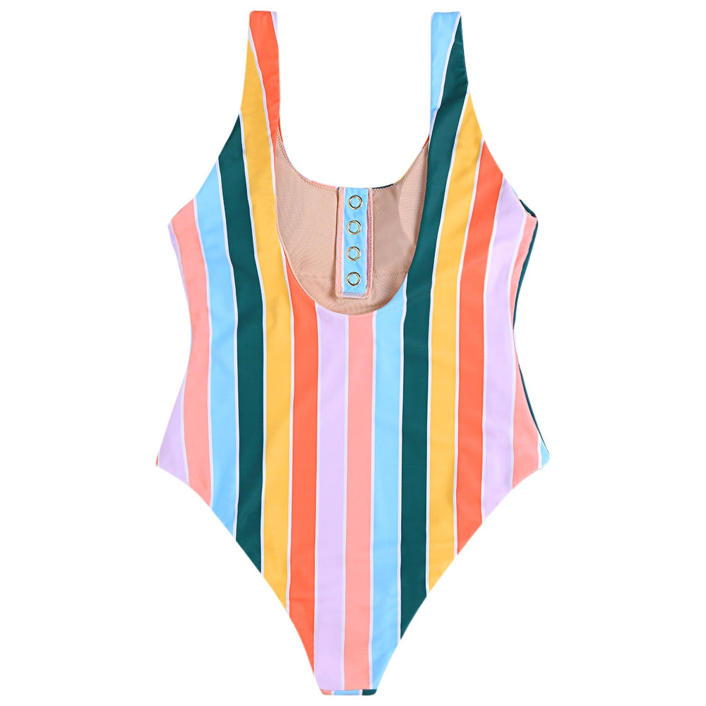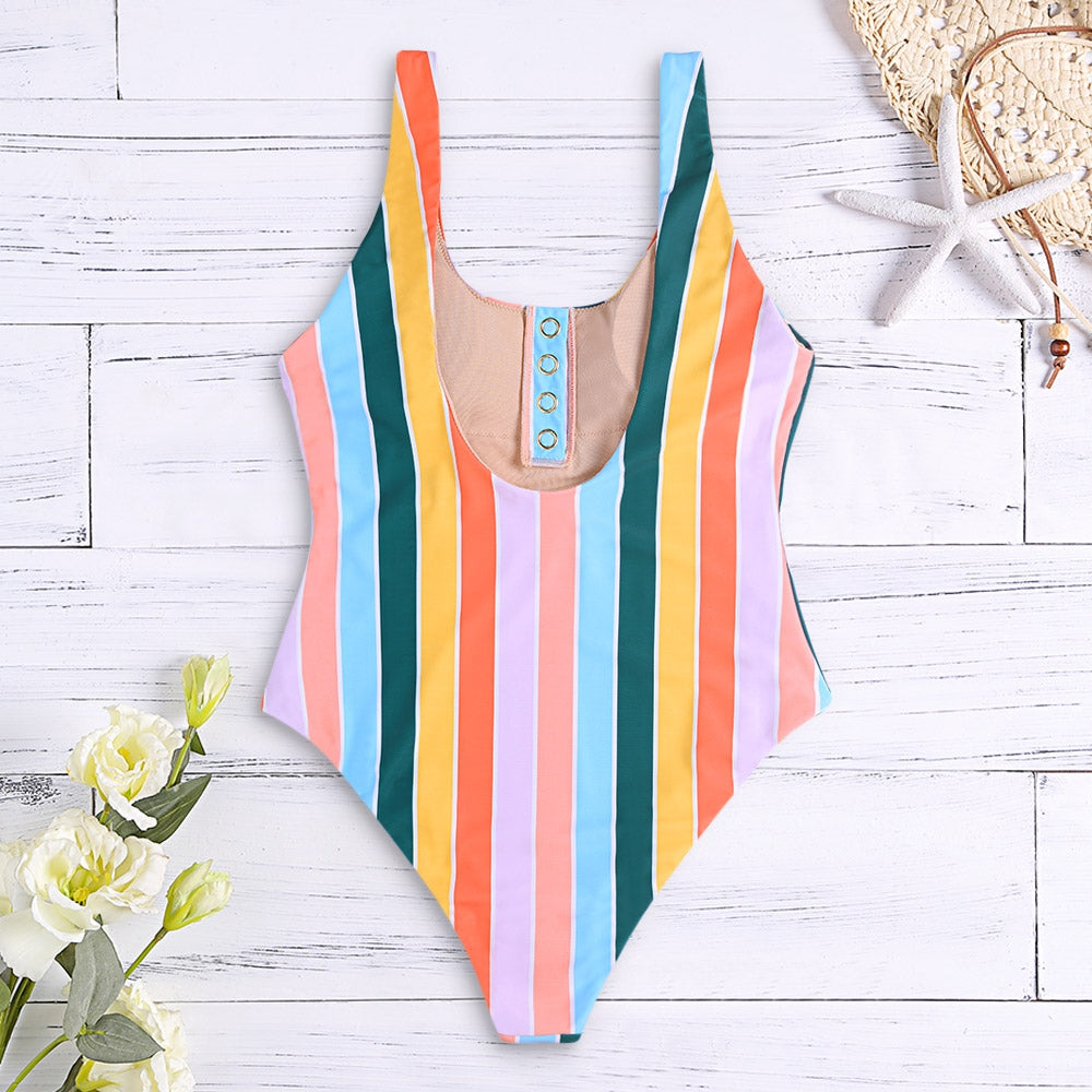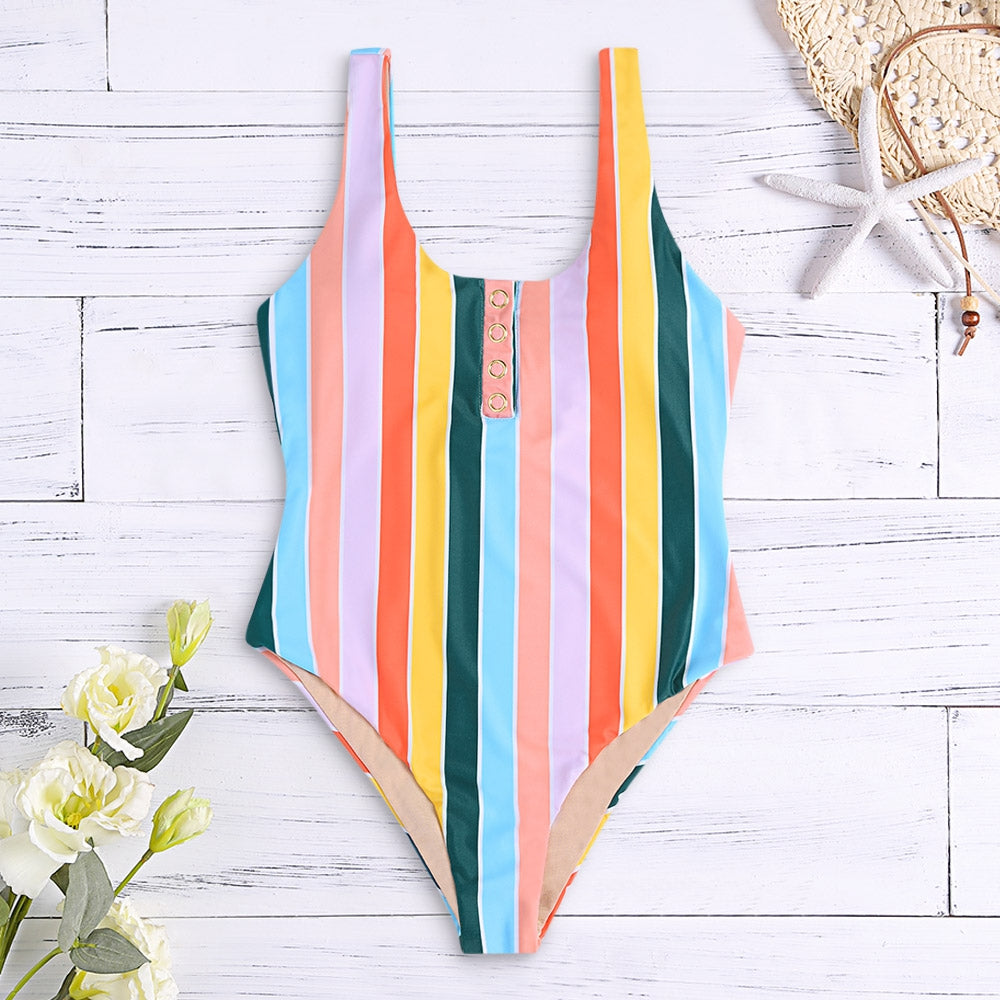 Sexy Scoop Neck Sleeveless Colorful Striped Backless Snap Button Padded Women Swimsuit