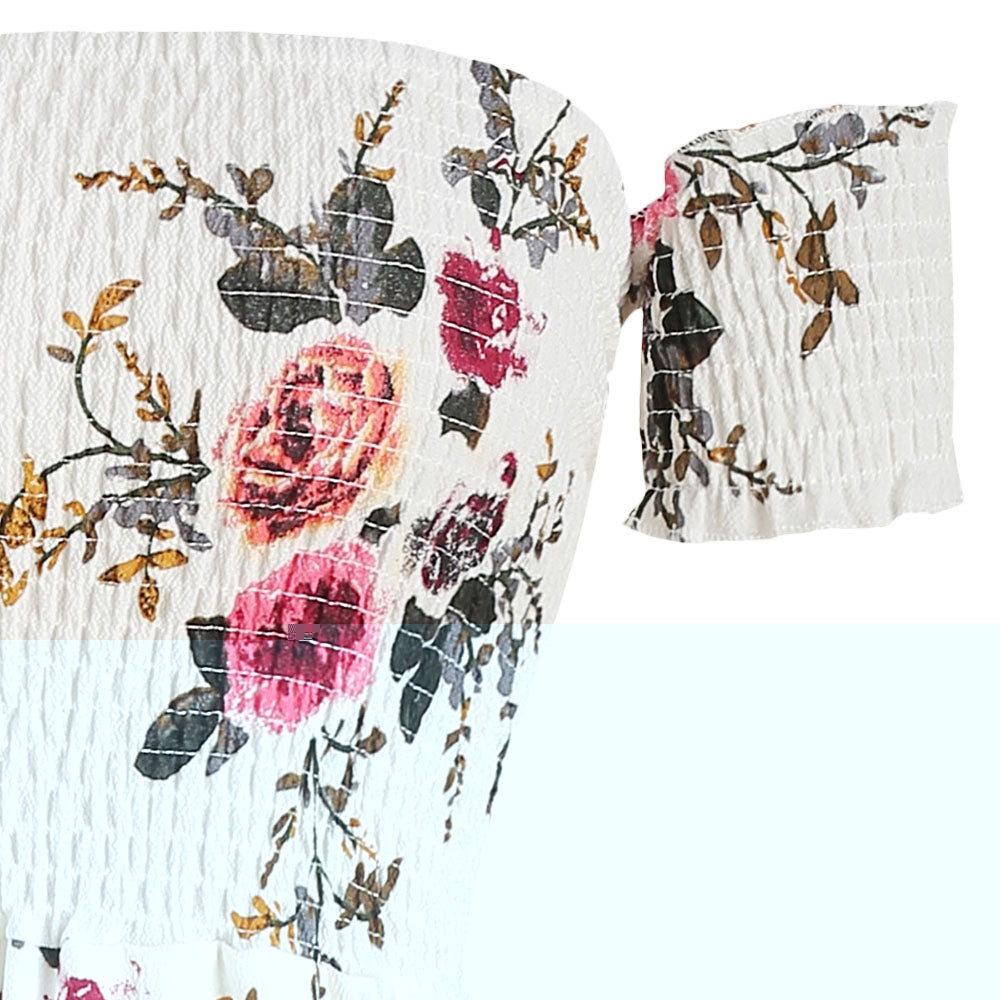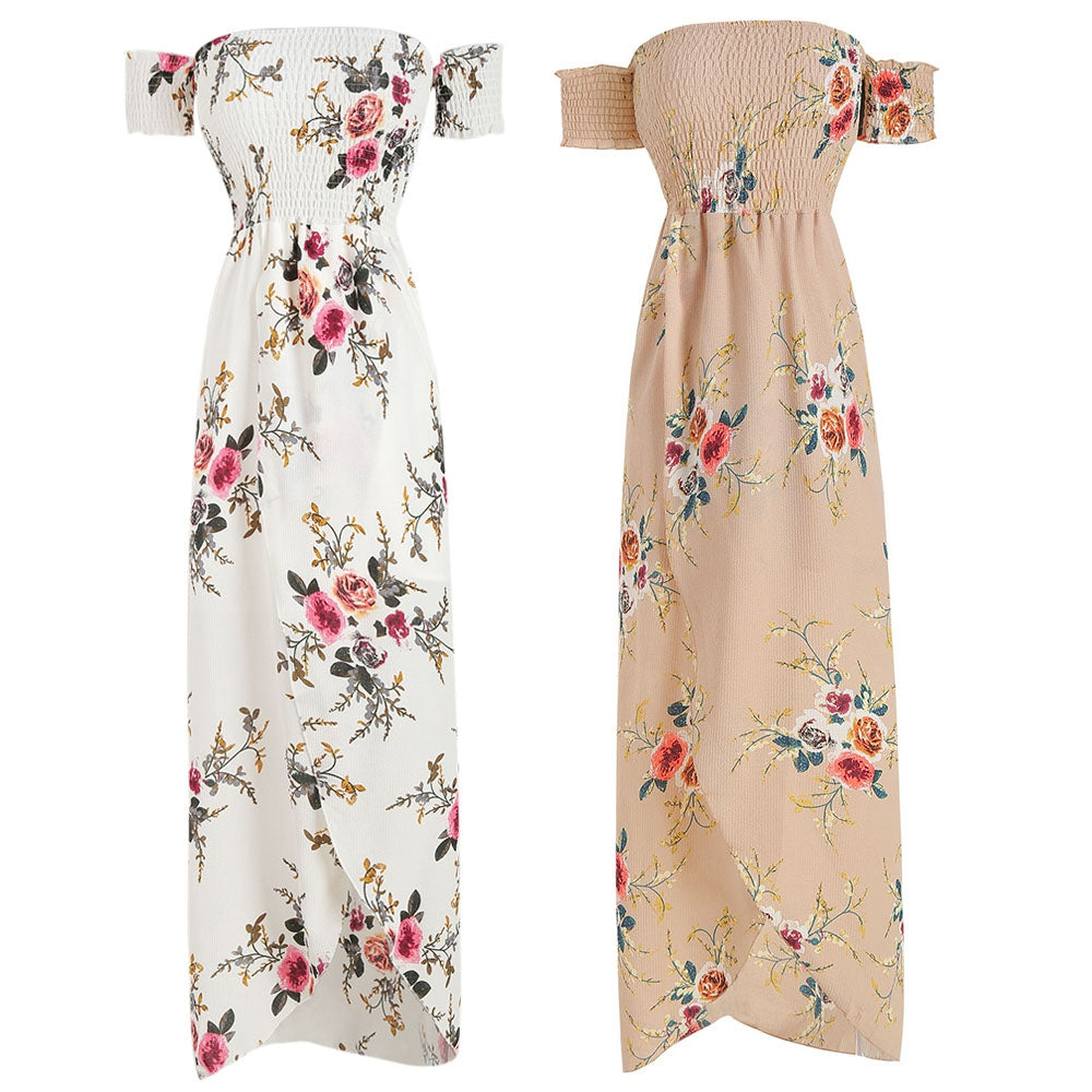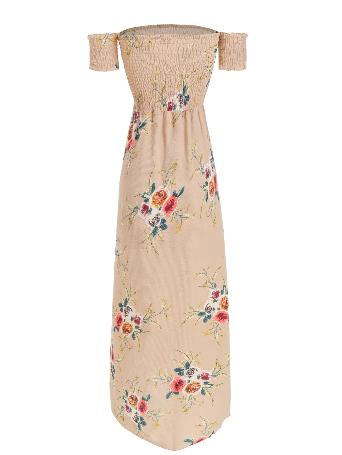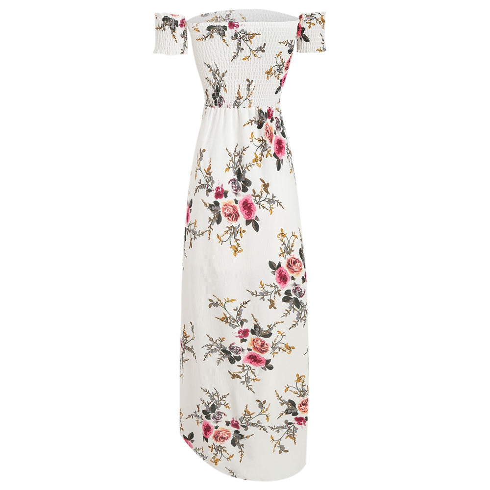The Maxi Dress features a smocked bodice and short off the shoulder sleeves. Front side split and floral print showing elegant.
