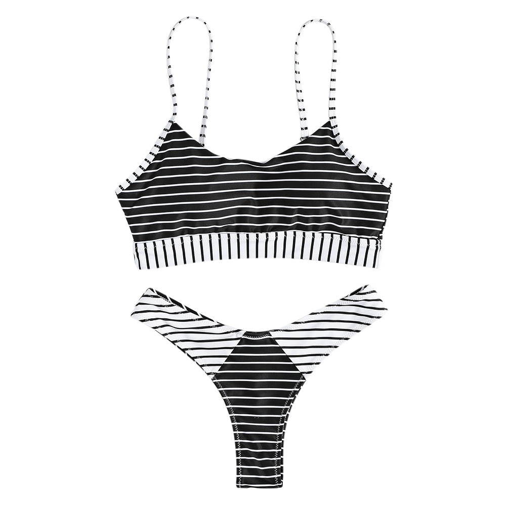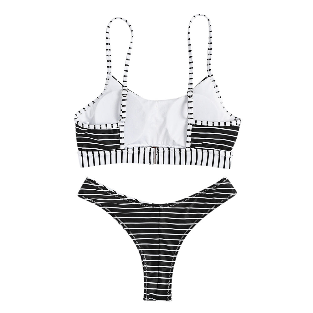 Sexy Spaghetti Strap Color Blocking Striped Print Padded Backless Low Waist Women Bikini Set