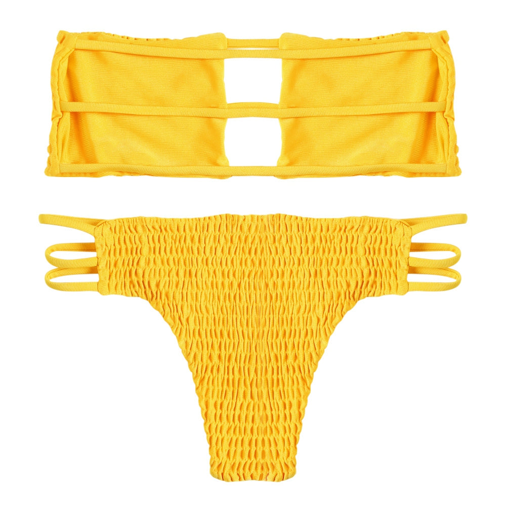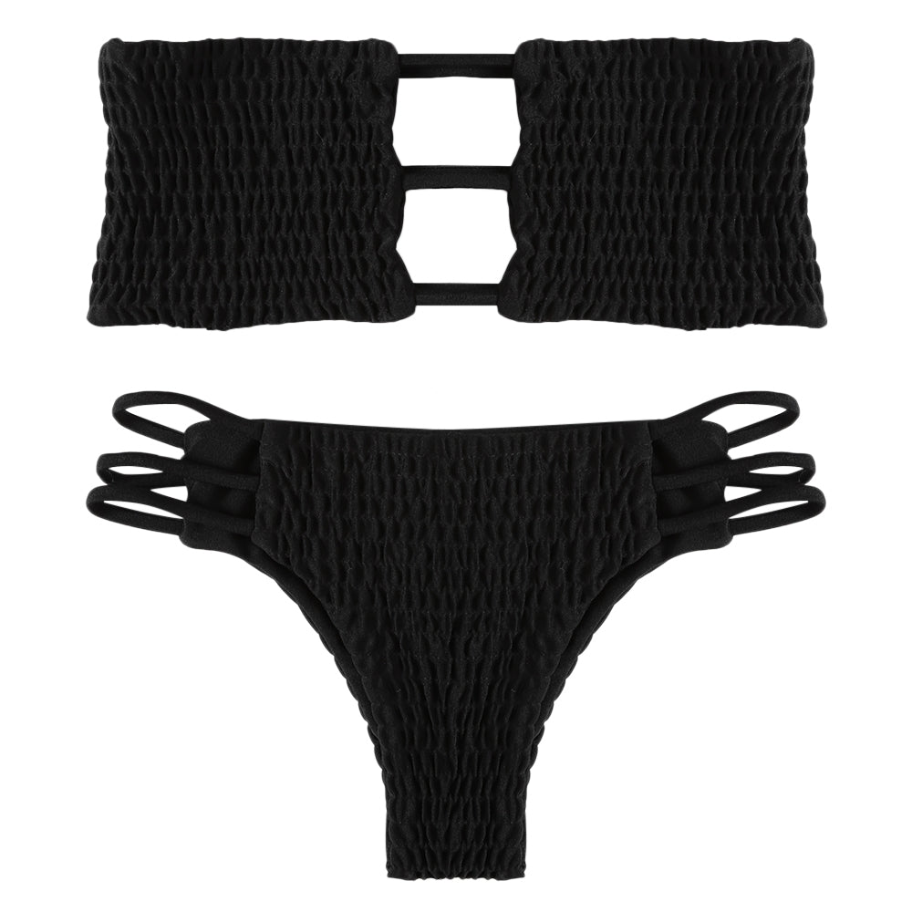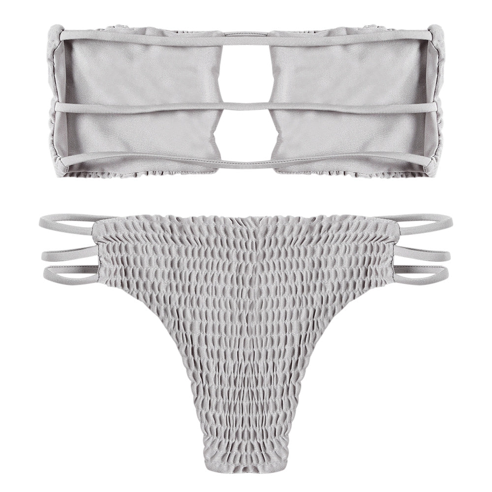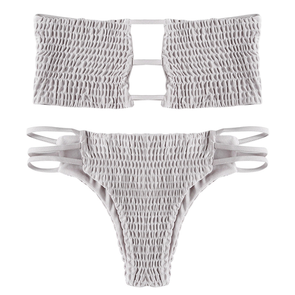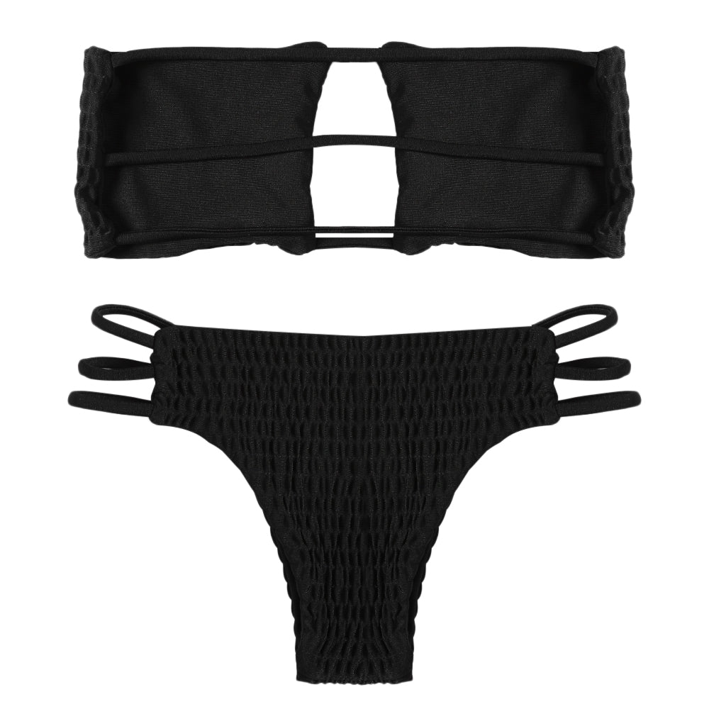 Strapless Backless Solid Color Low Waist Shirring Strappy Swimsuit Women Bikini Set