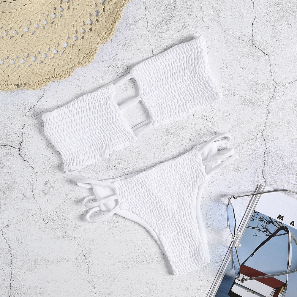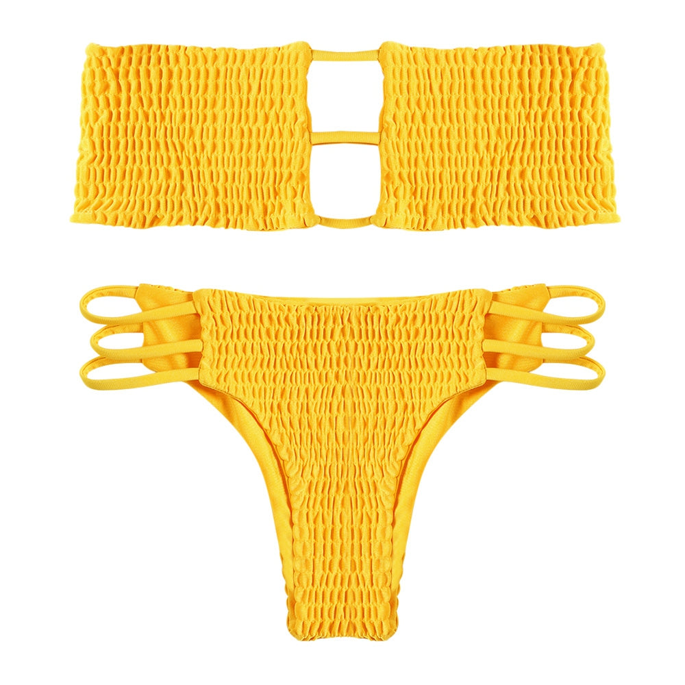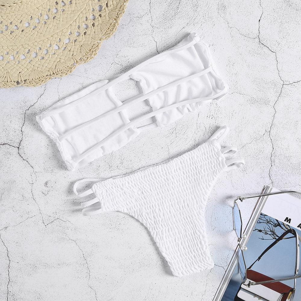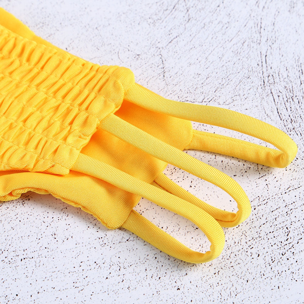 Strapless Backless Solid Color Low Waist Shirring Strappy Swimsuit Women Bikini Set