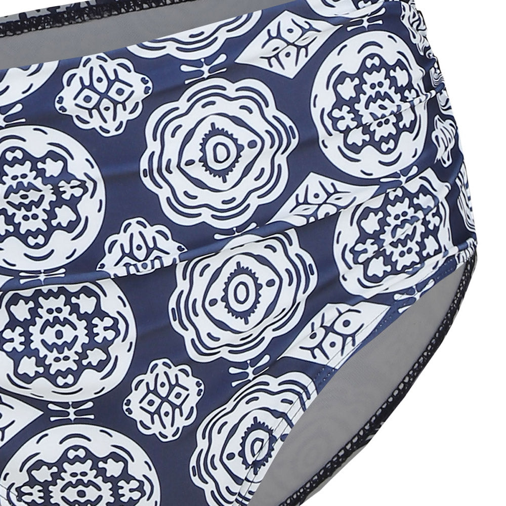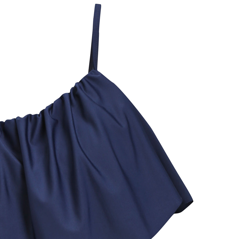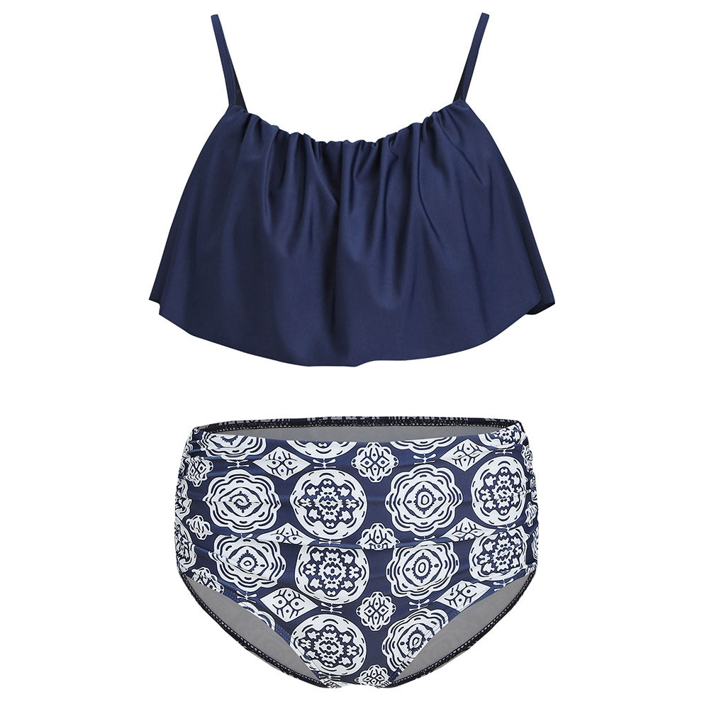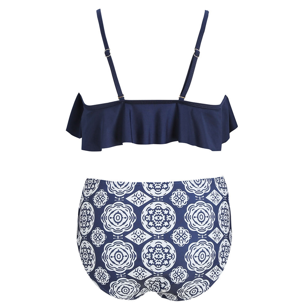 Our Bikini set is the perfect combination of beauty and grace. Detailed with ruffled overlay and spaghetti straps. Includes tribal print matching bikini bottom.