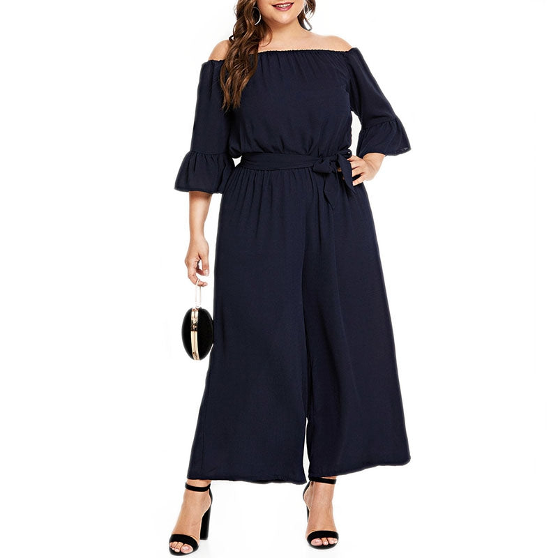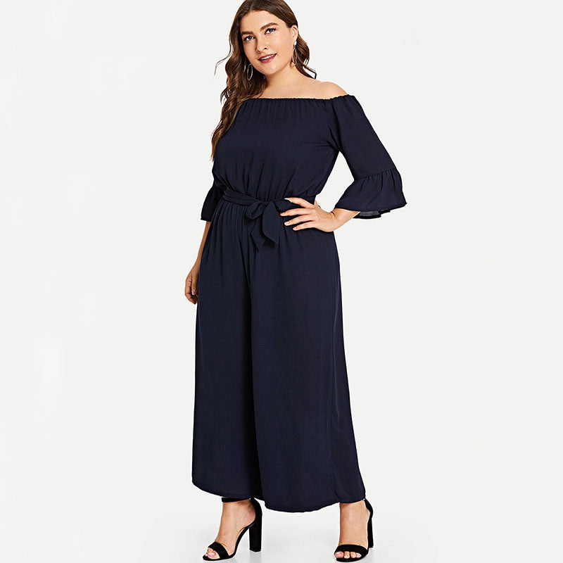 Solid Color One Word Collar Flare Sleeve High Waist Lace Up Jumpsuit