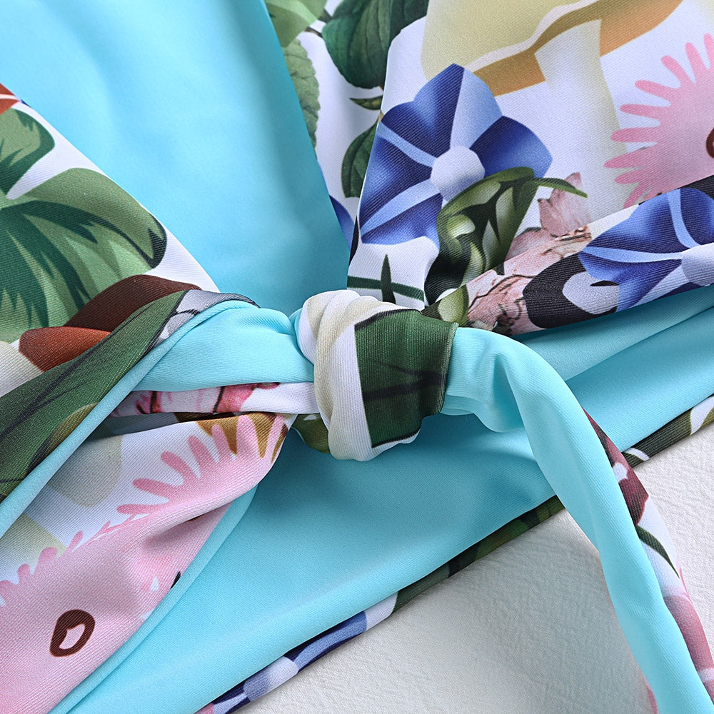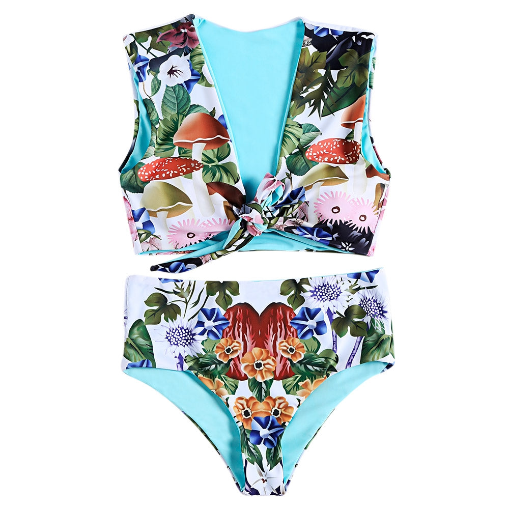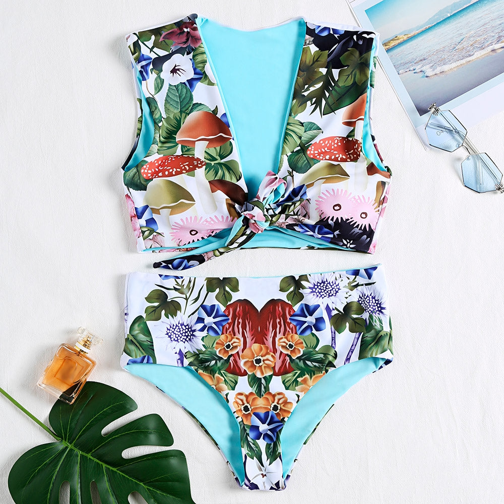 Plunge Neck Sleeveless Padded Floral Print High Waist Two-piece Women Bikini Set