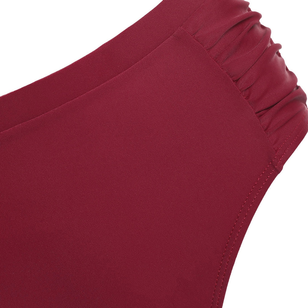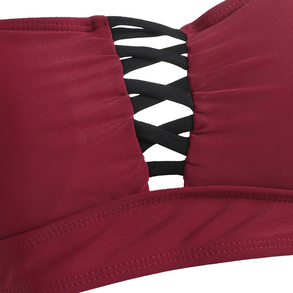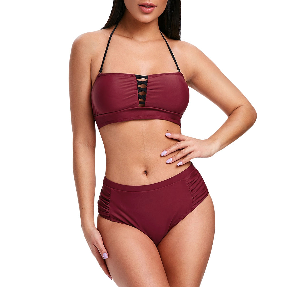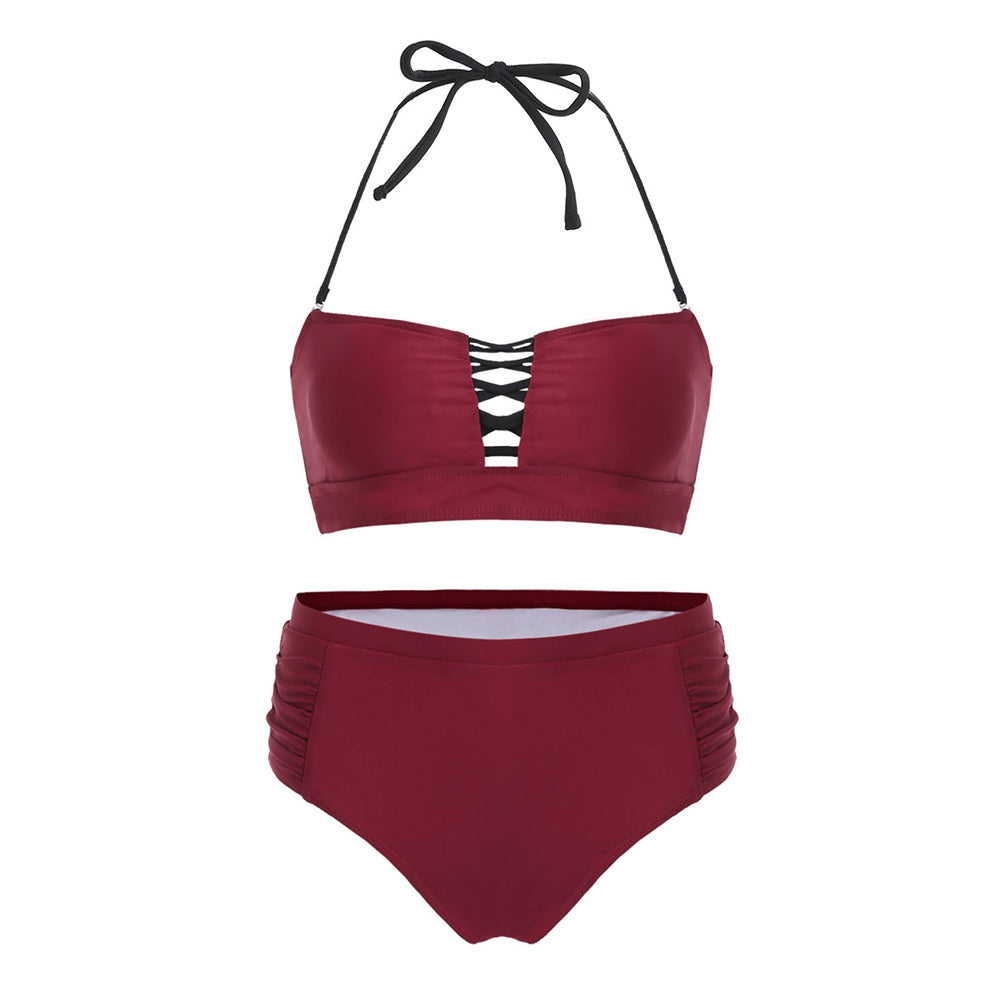 Soak up the sun with this alluring bikini, it will bring a comfortable and enjoyable time. In a solid color hue, this two-piece bikini features a detachable halter neck with front criss-cross detail. The removable padded cup designed. Ruched swim bottoms for a flattering and charming look.