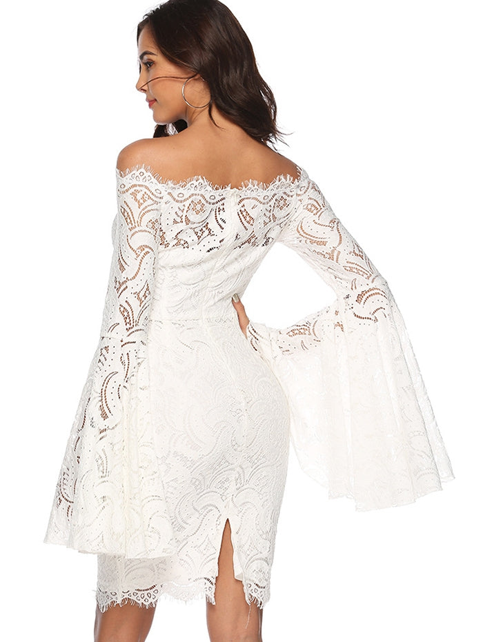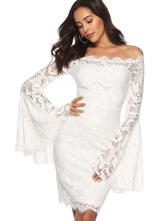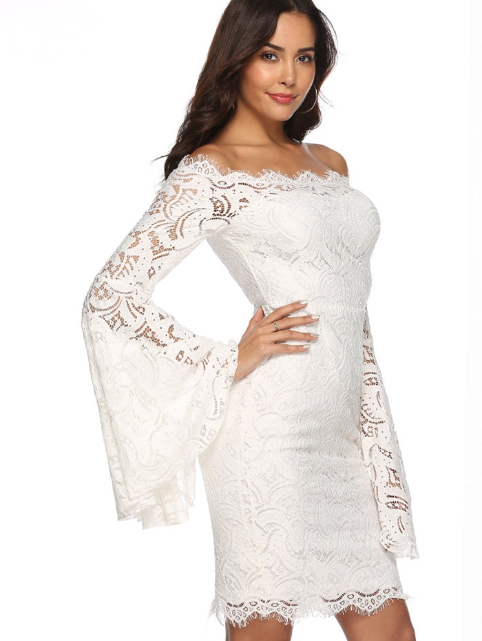 Women's Off Shoulder Flare Sleeve Lace Slim Bodycon Party Wedding White Dress
