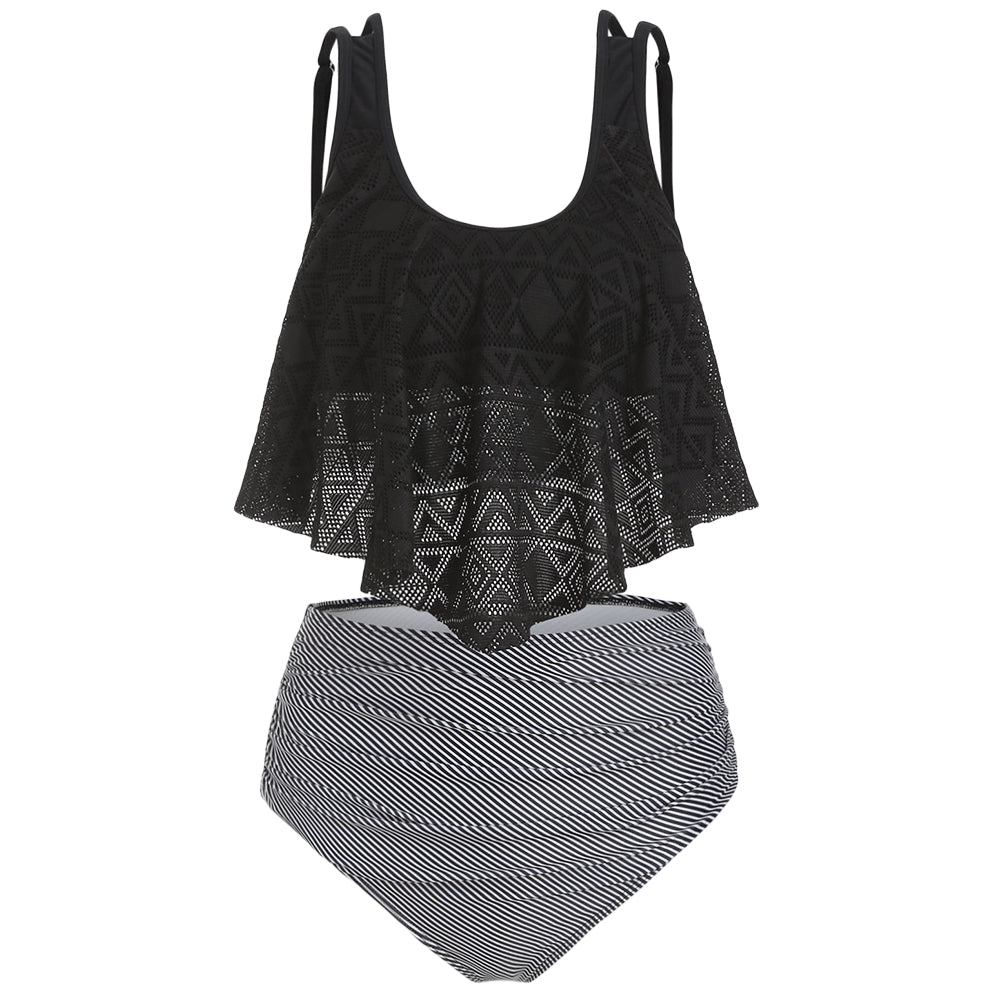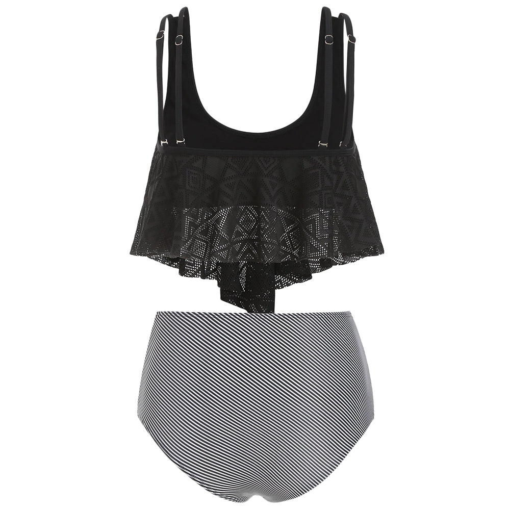 Perforated Flounce Floral Striped Ruched Tankini Swimsuit