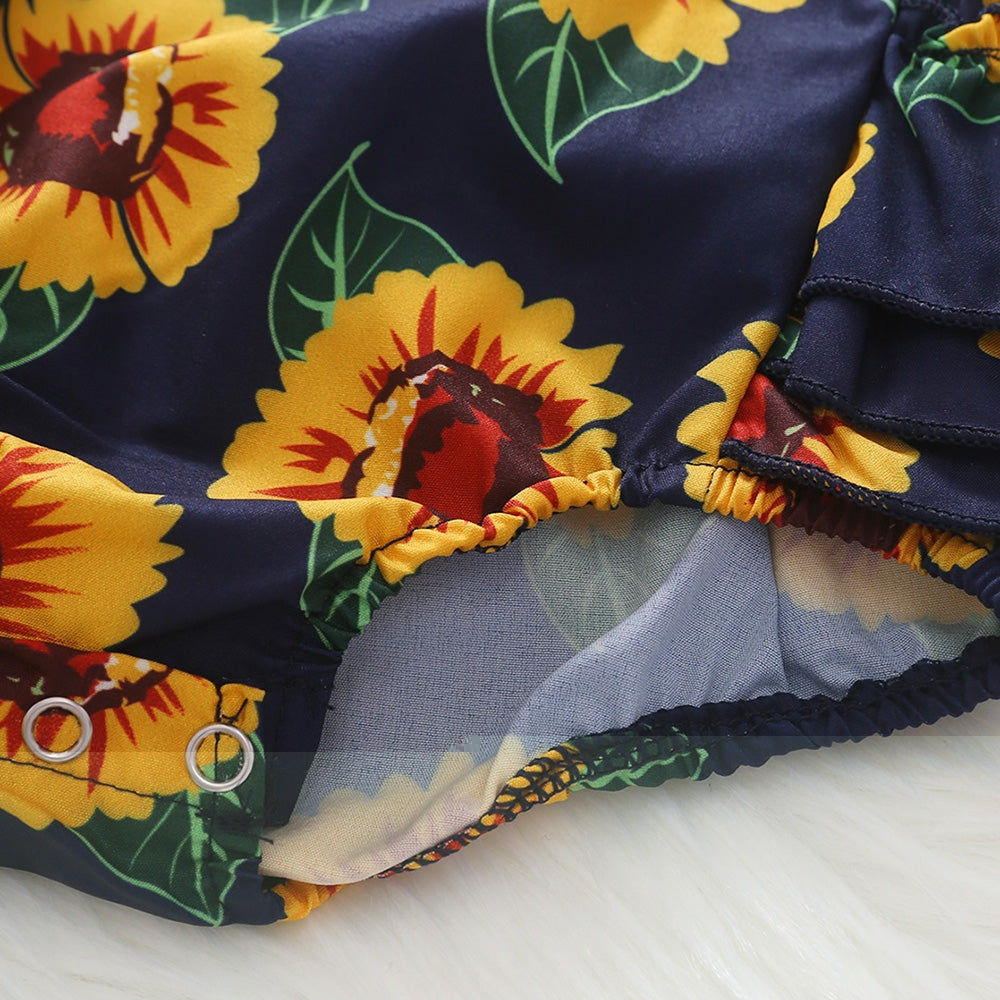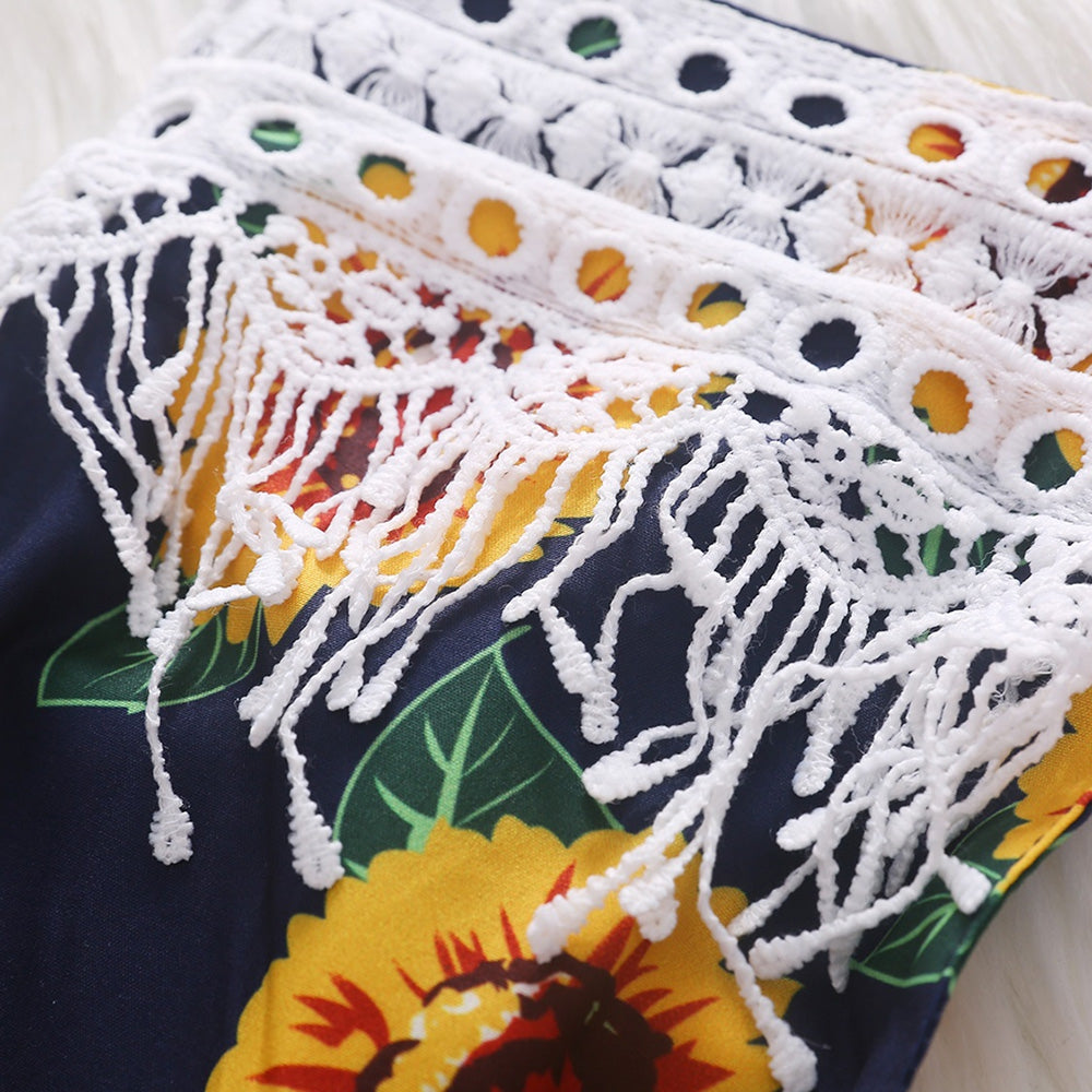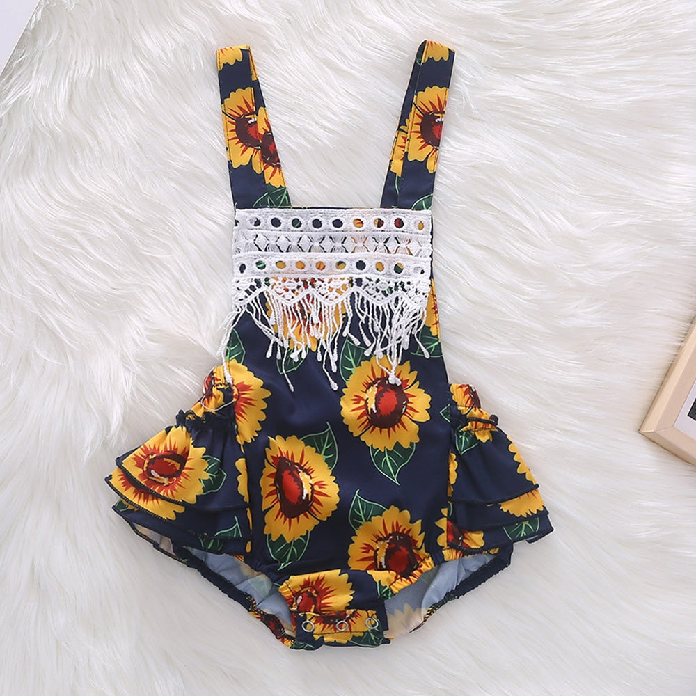 1267 Girls Cotton Sunflower Flower Print Tassel Romper Jumpsuit