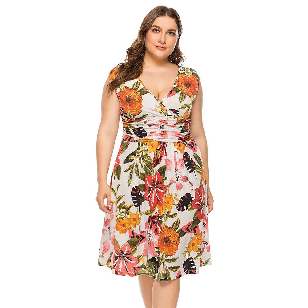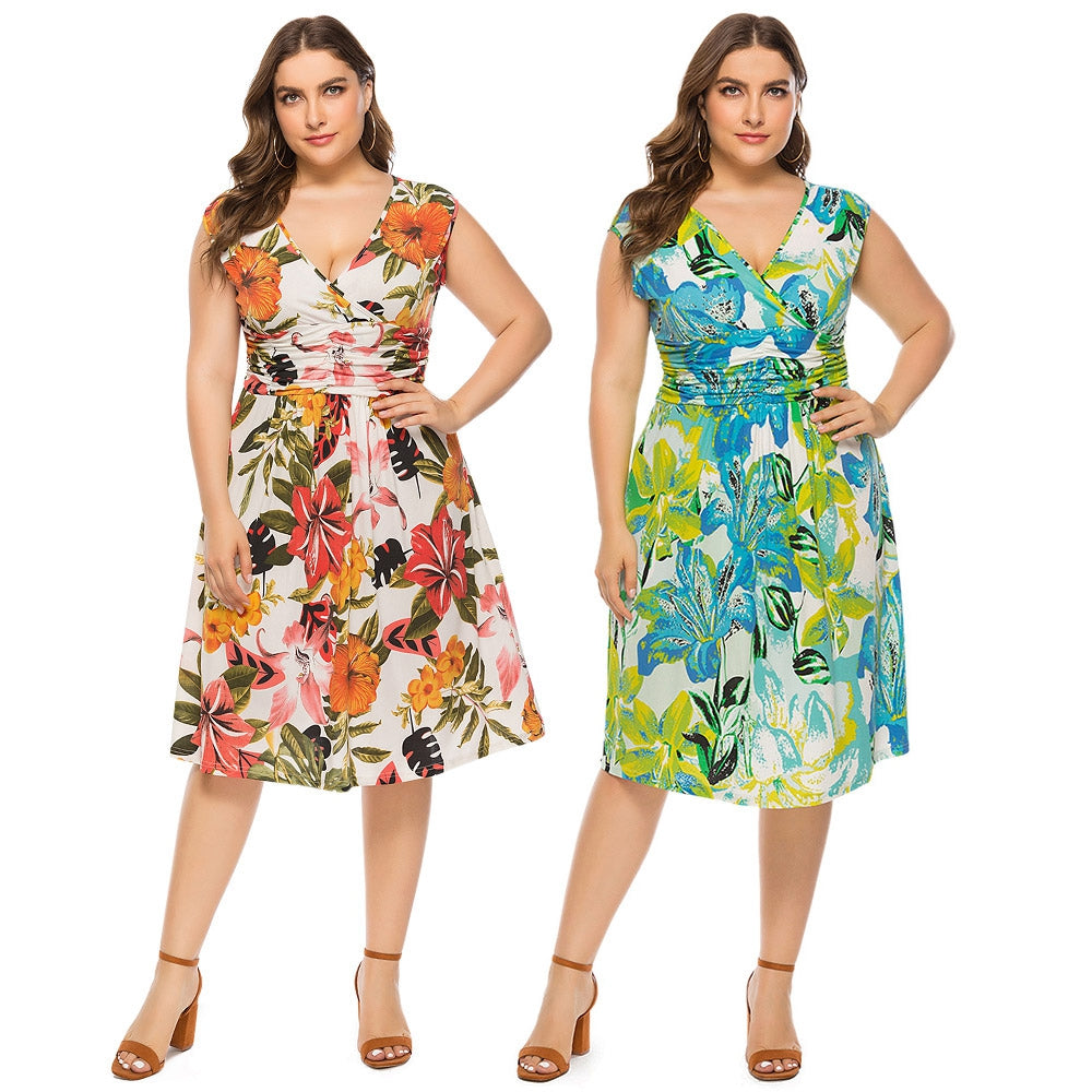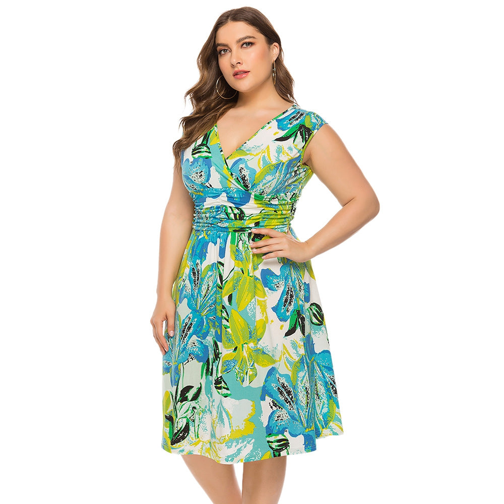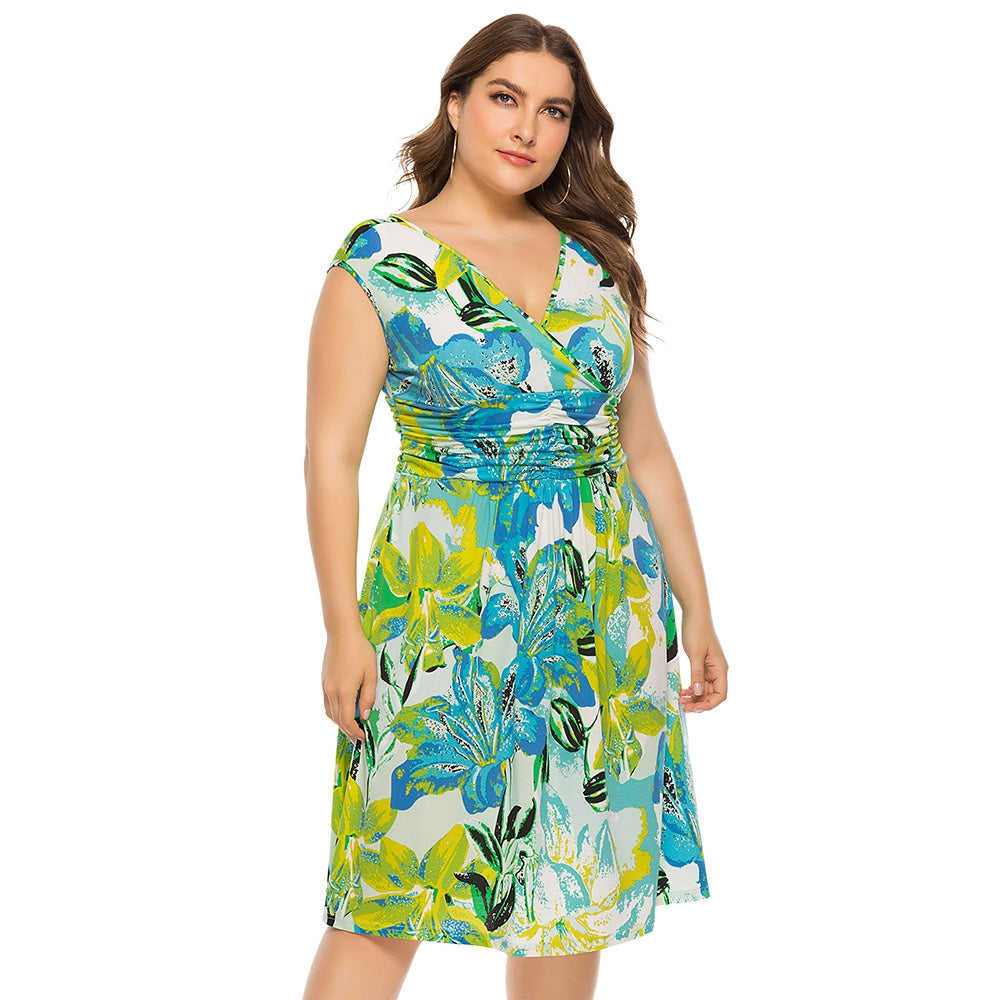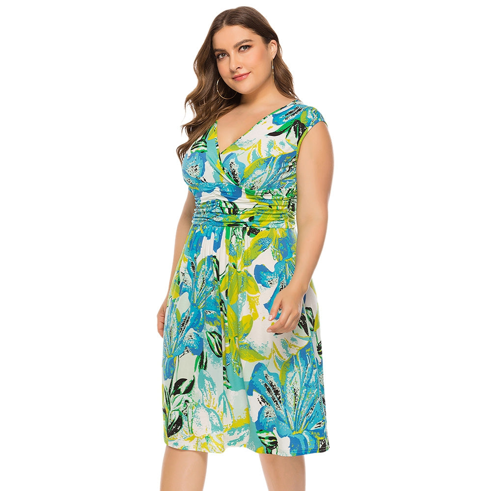 Plus Size Floral Printed Dress Women V Neck High Waist
