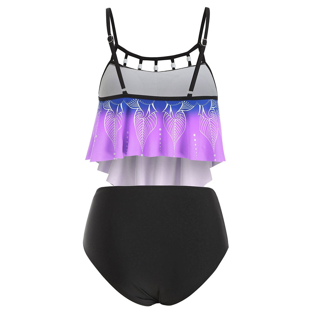 Leaf Print Flounce Cami High Waisted Tankini Swimwear