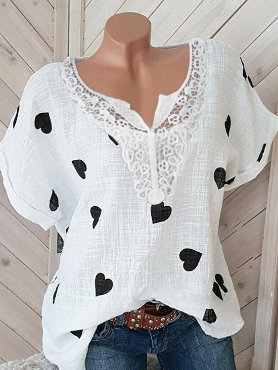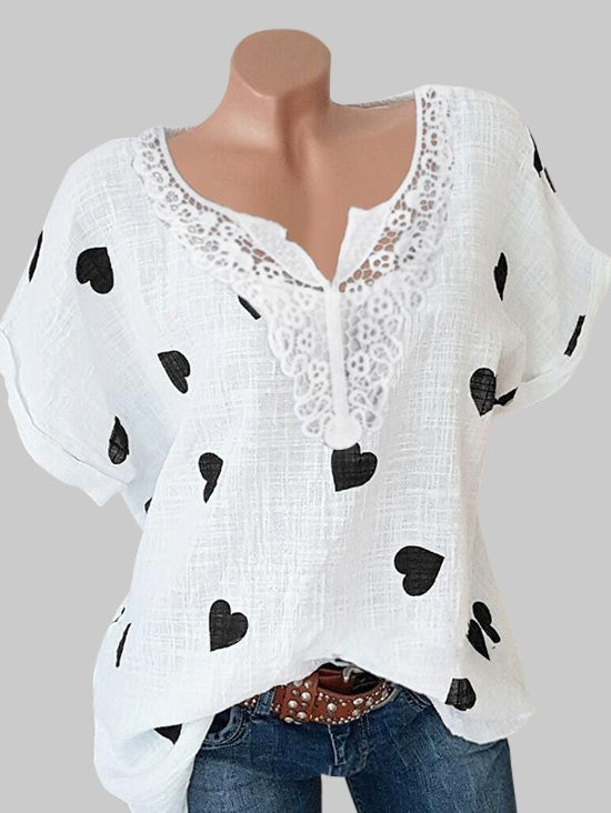 A feminine blouse features a sheer crochet lace yoke, short sleeves, and a pretty heart print for an on-trend look.