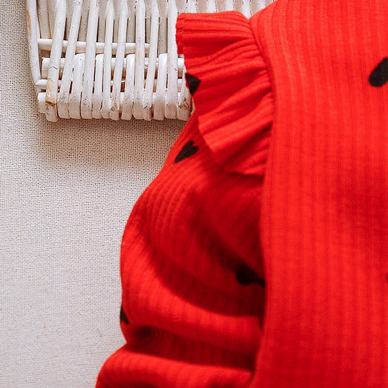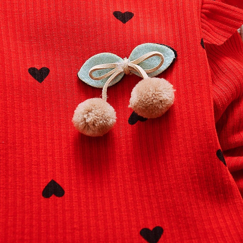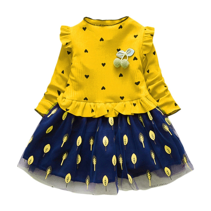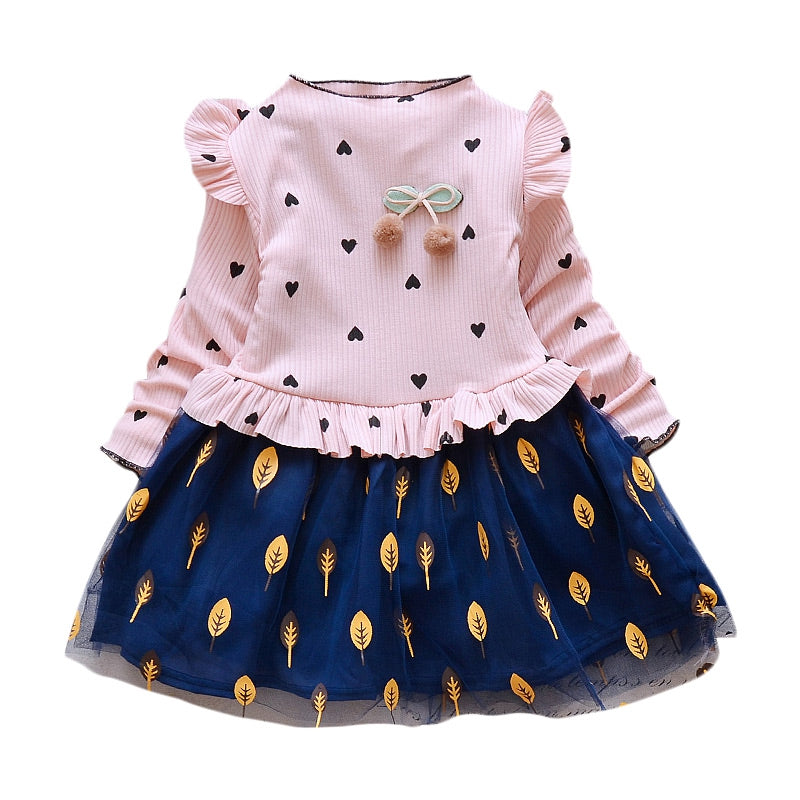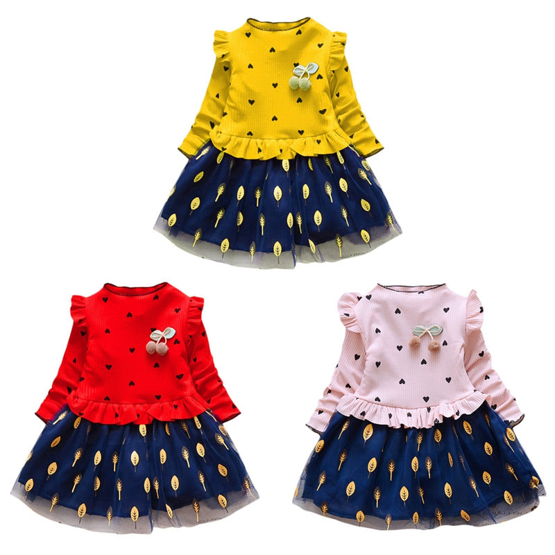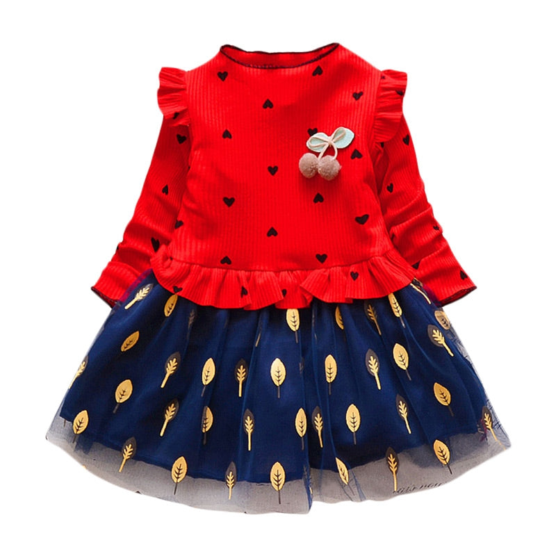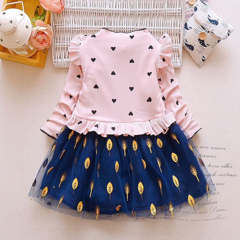 Ruffle Leaf Print Girl Dress Stand Collar Long Sleeve Heart Print Mesh Children Garment