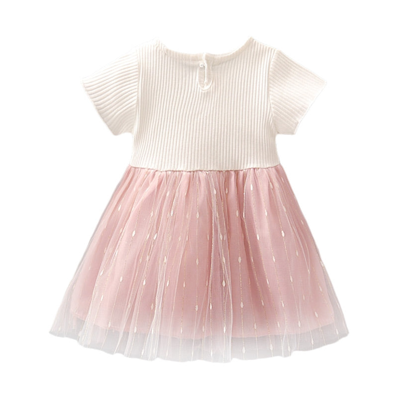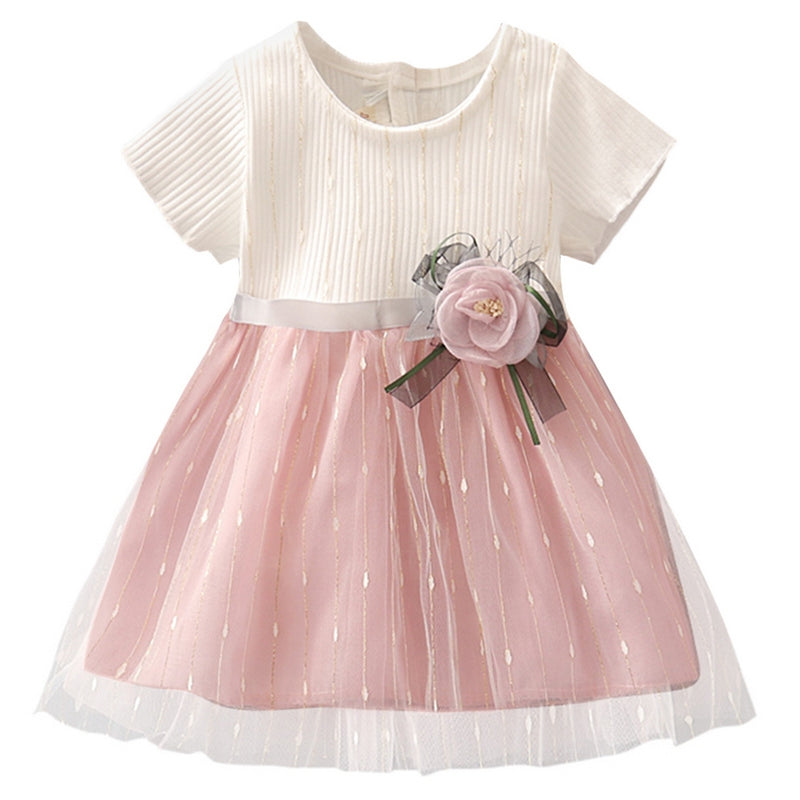 Flower Mesh Girl Princess Dress Round Collar Short Sleeve Comfortable Children Garment