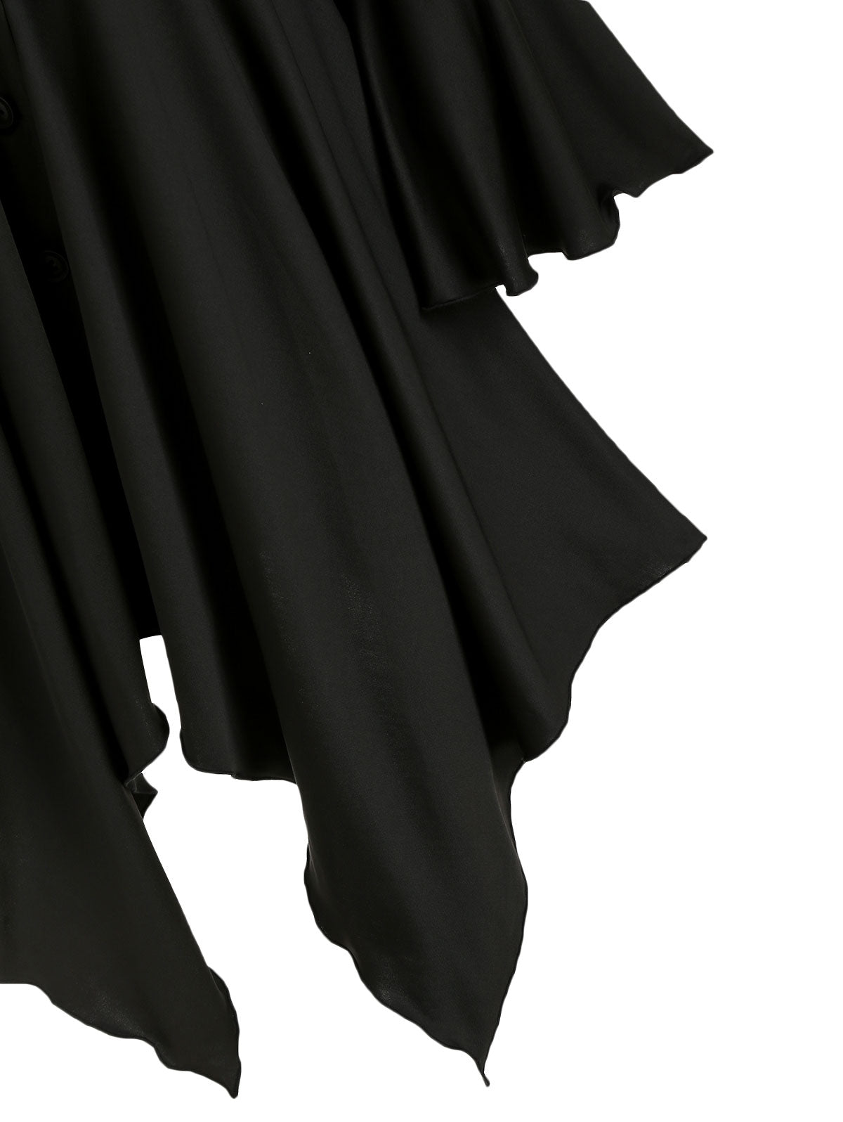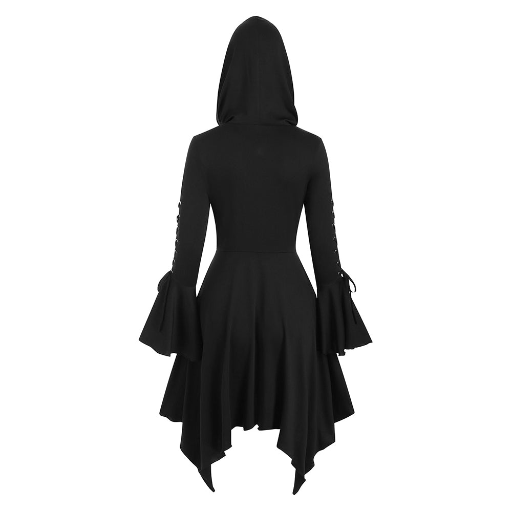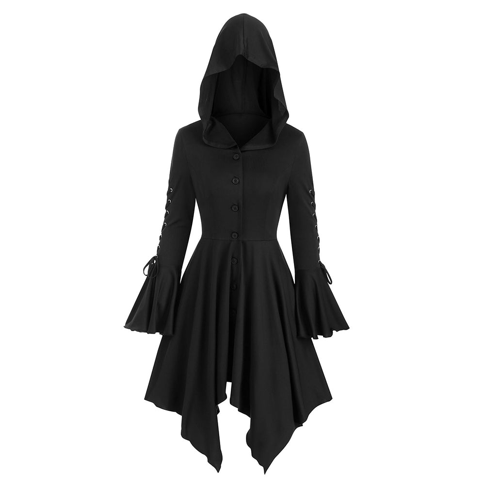 Hooded Lace-up Poet Sleeve Button Up Hanky Hem Skirted Gothic Coat