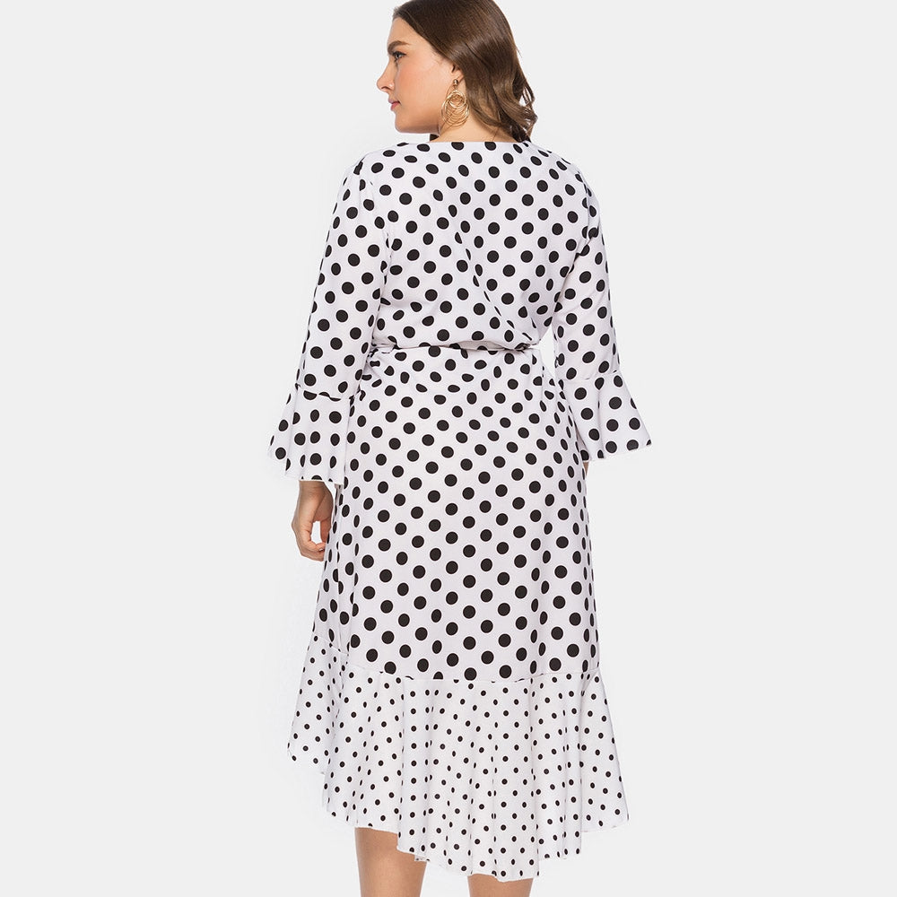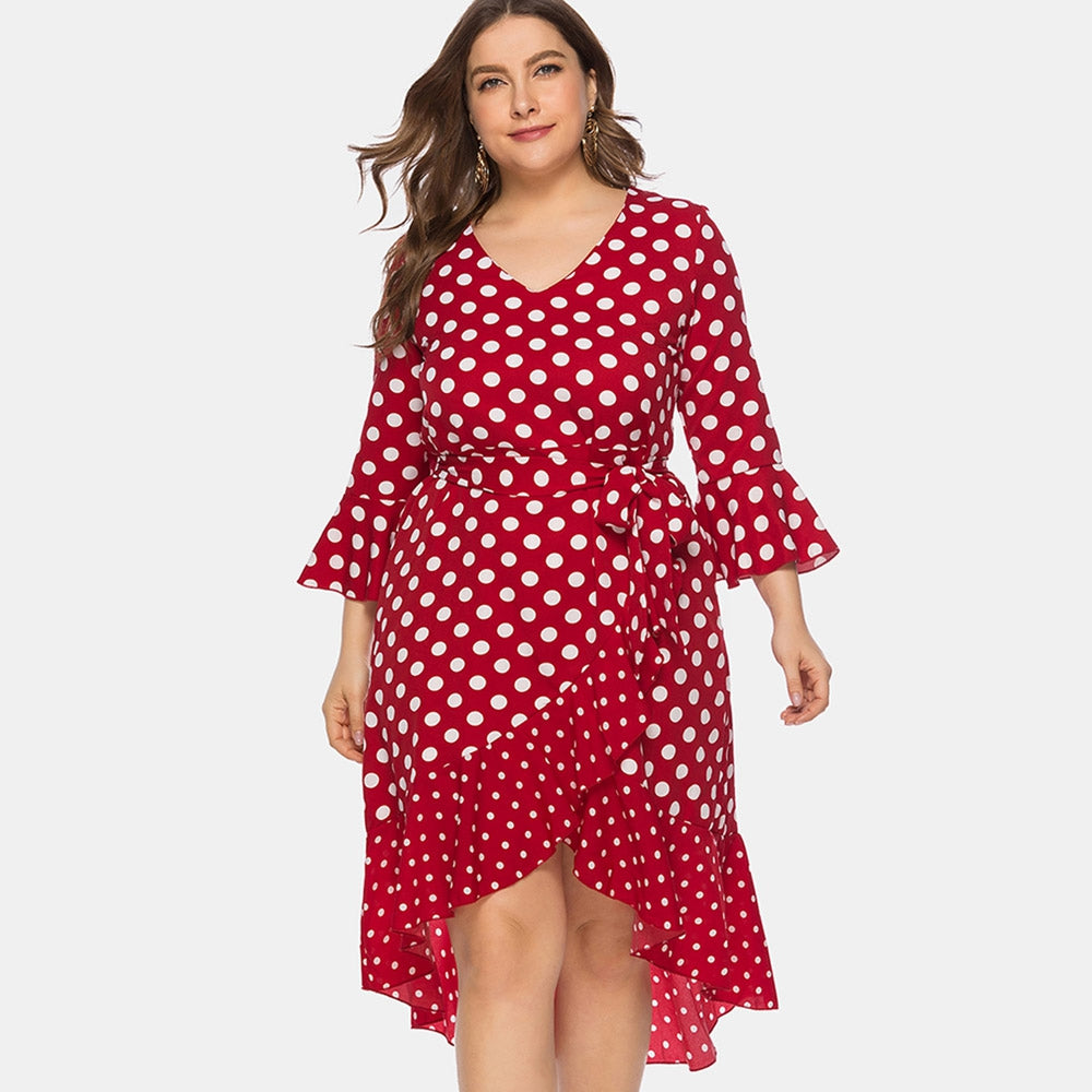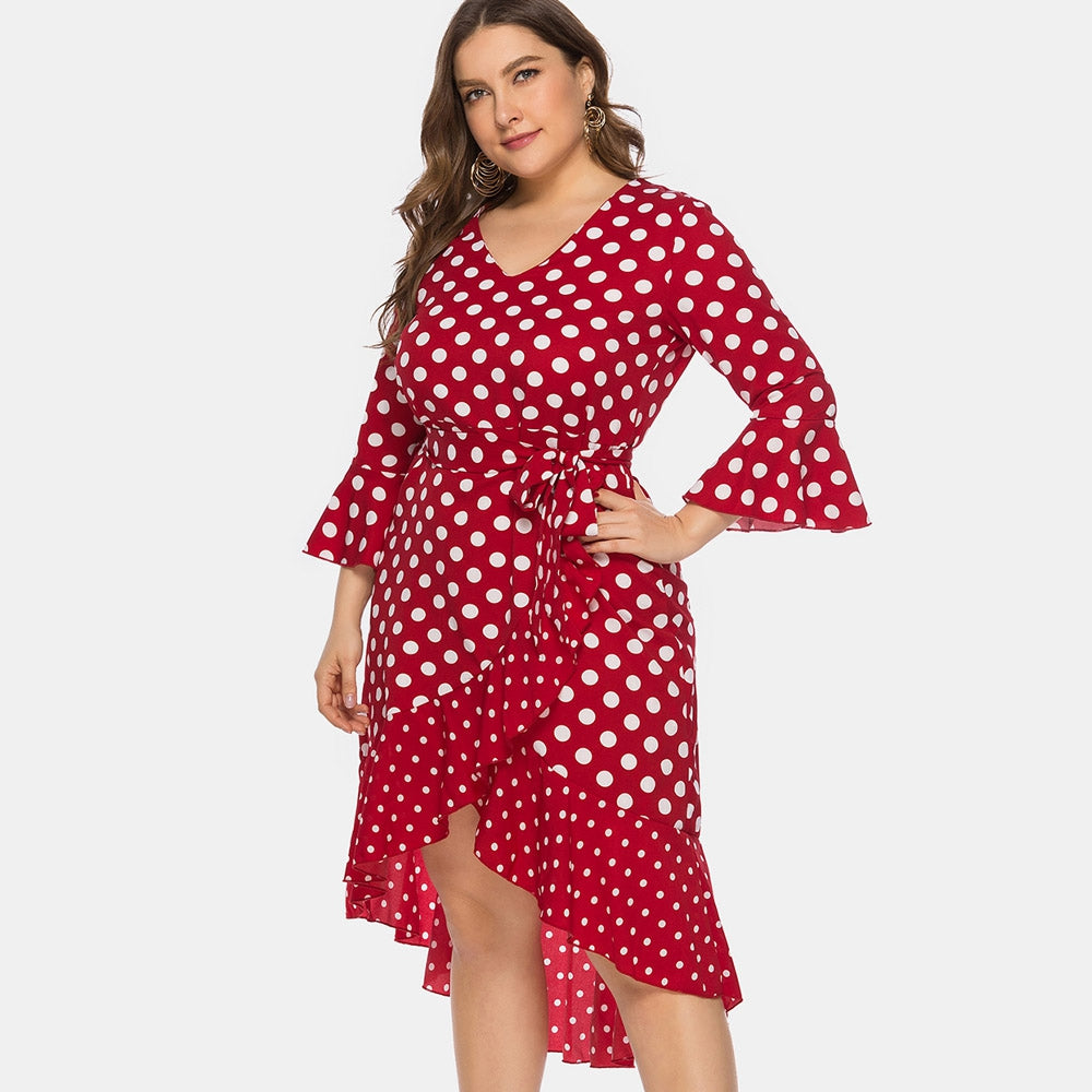 Polka Dot Flounces Belted High Low Plus Size Dress