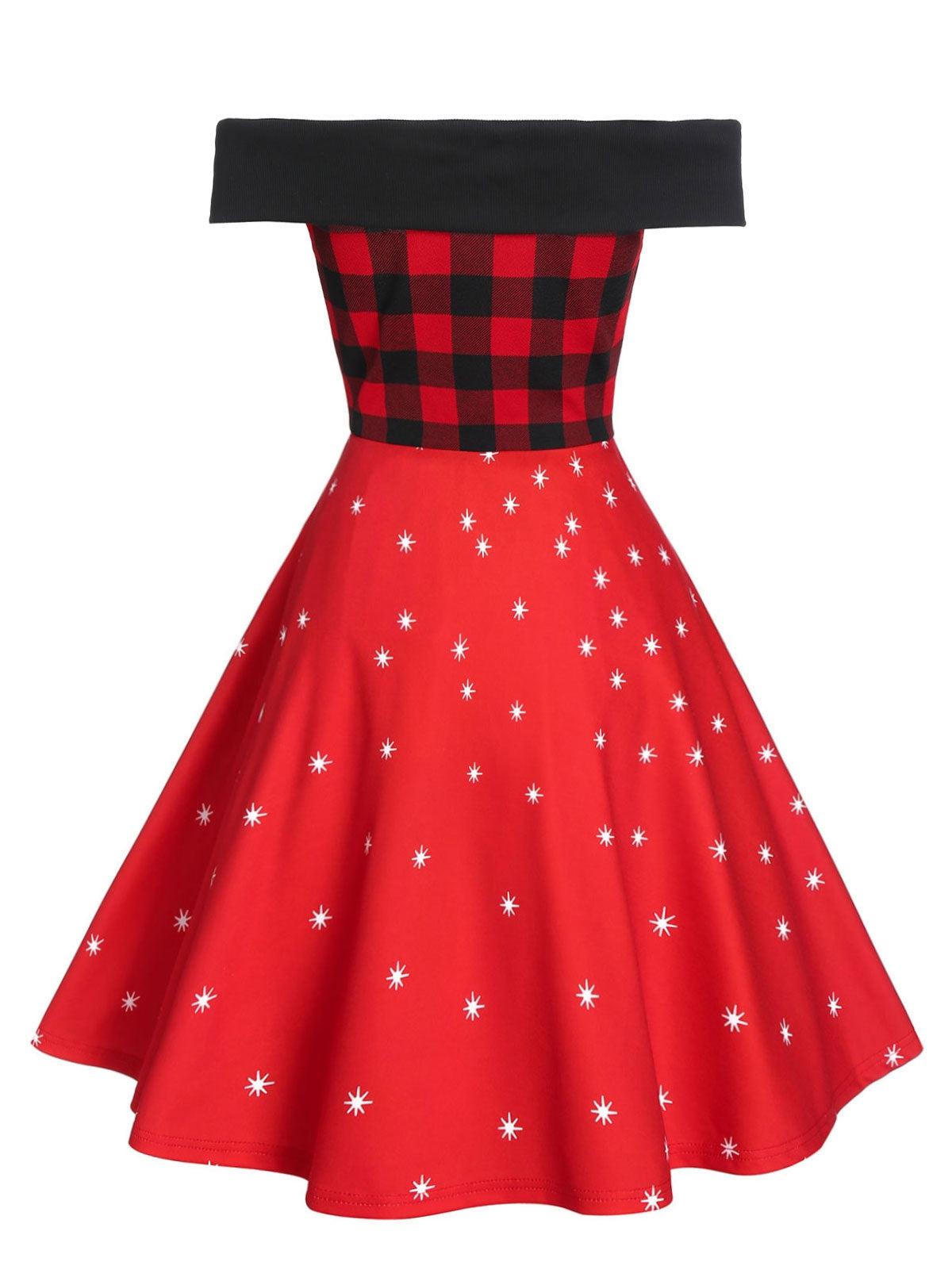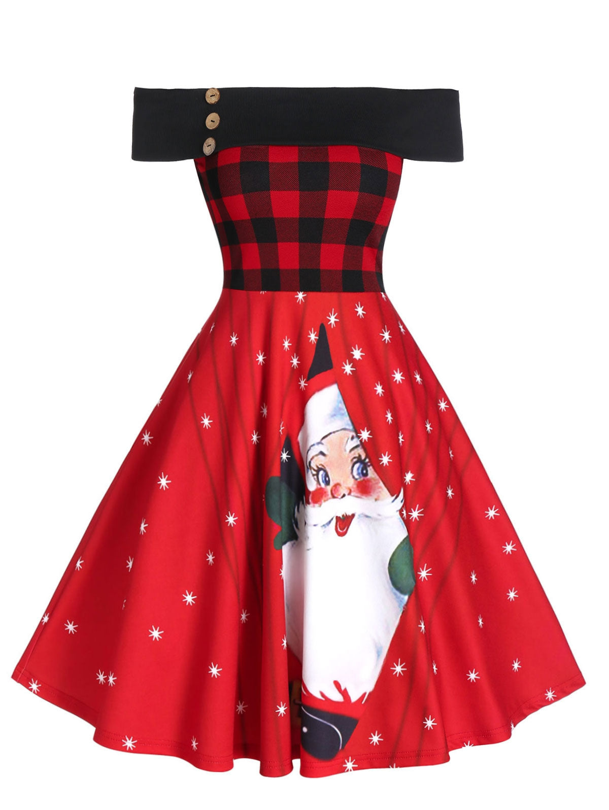 Off The Shoulder Plaid Santa Claus Print Christmas Dress