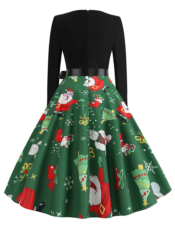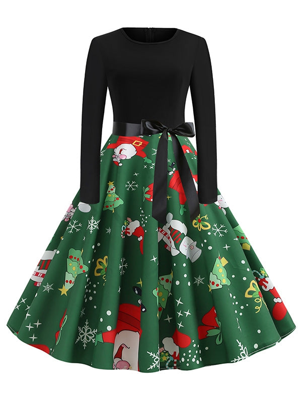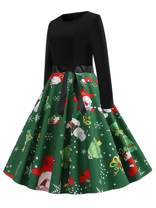 Christmas Tree Snowflake Belted Long Sleeve Dress