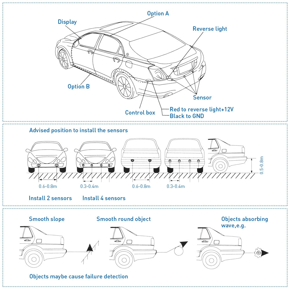 - Detection distance: 0 - 2.5m (rear), 0 - 1.2m (front)