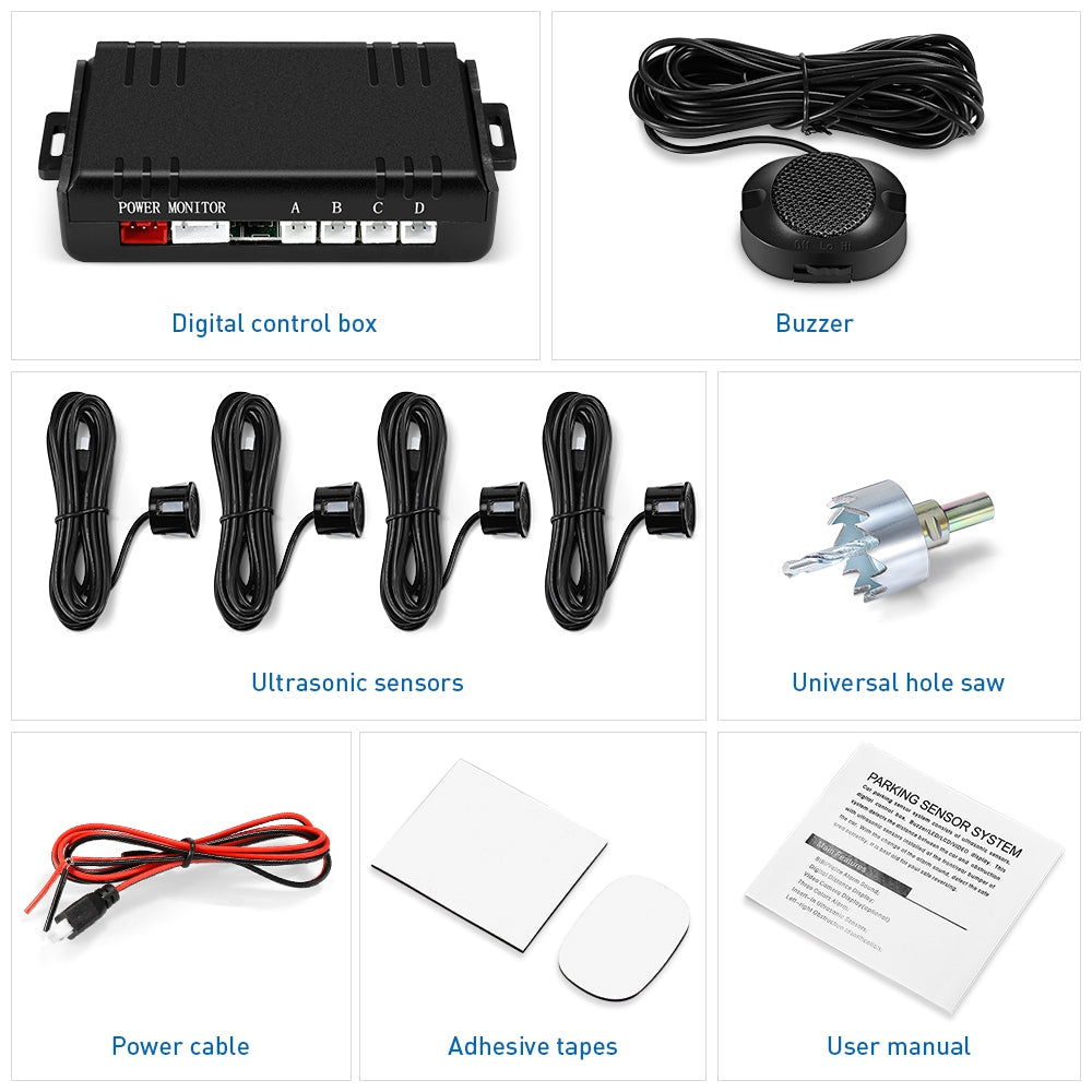 Package Contents: 1 x Digital Control Box, 1 x Buzzer, 4 x Ultrasonic Sensor, 1 x Hole Saw, 1 x Power Cable, 2 x Adhesive Tape, 1 x English User Manual
