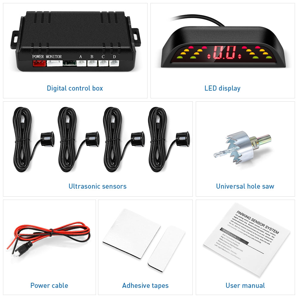 Package Contents: 1 x Digital Control Box, 1 x LED Display, 4 x Ultrasonic Sensor, 1 x Hole Saw, 1 x Power Cable, 2 x Adhesive Tape, 1 x English User Manual