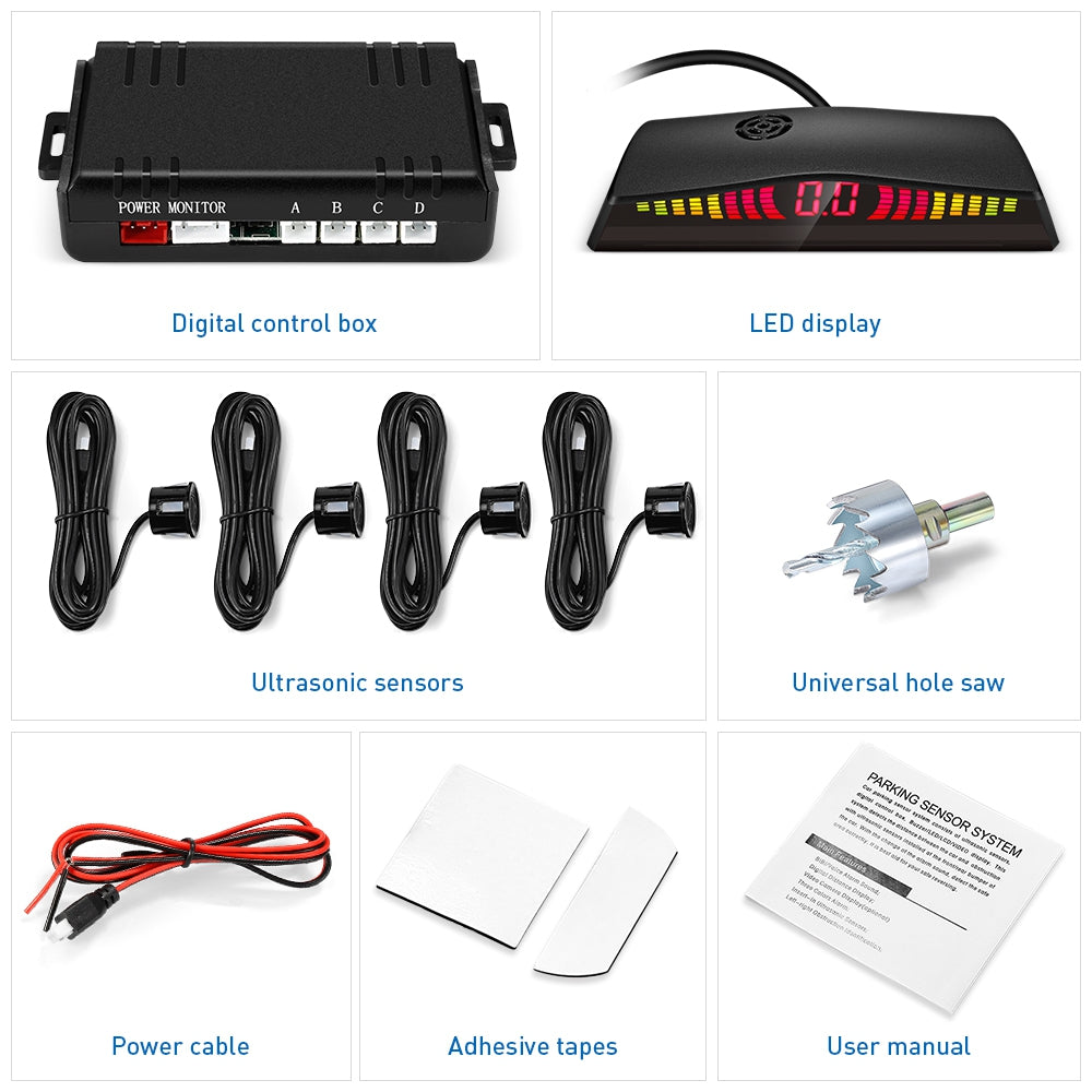 Package Contents: 1 x Digital Control Box, 1 x LED Display, 4 x Ultrasonic Sensor, 1 x Hole Saw, 1 x Power Cable, 2 x Adhesive Tape, 1 x English User Manual