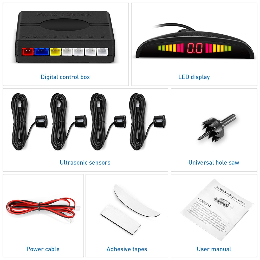 Package Contents: 1 x Digital Control Box, 1 x LED Display, 4 x Ultrasonic Sensor, 1 x Hole Saw, 1 x Power Cable, 2 x Adhesive Tape, 1 x English User Manual