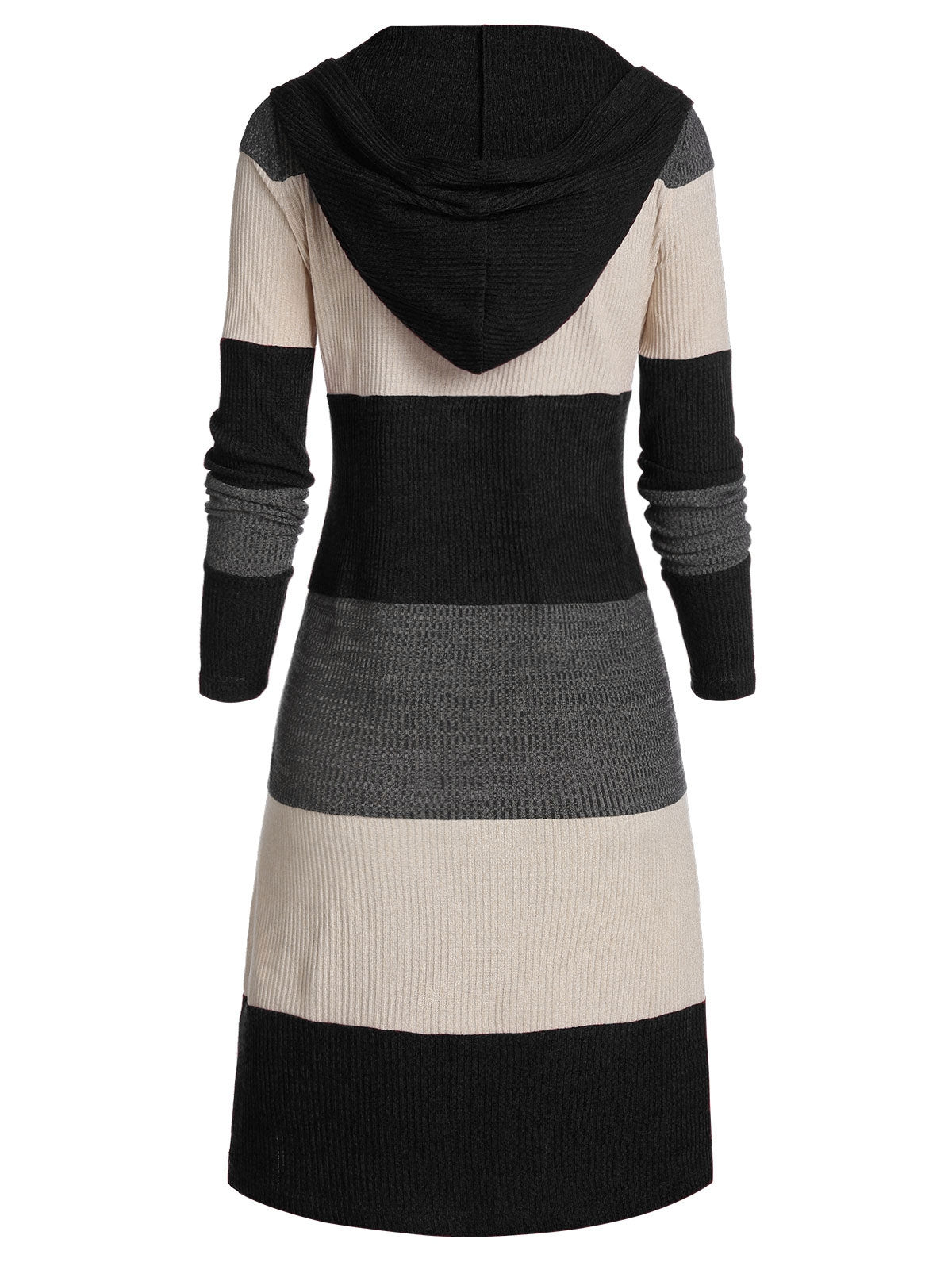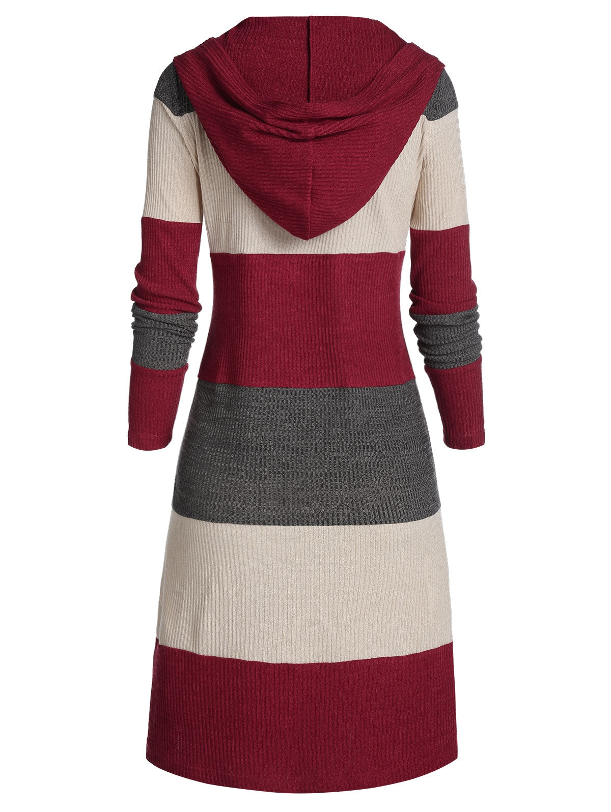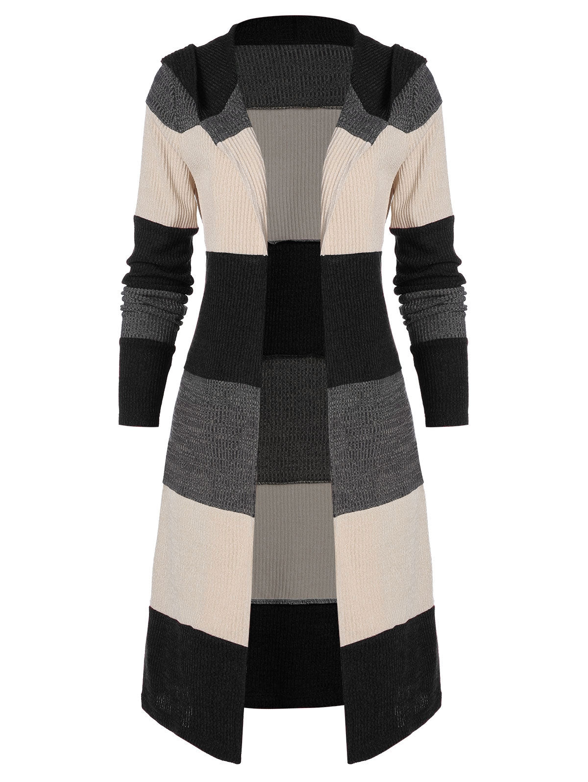 Comfy knit patterned in colorblock stripes adds a stylish flair to this longline hooded cardigan.