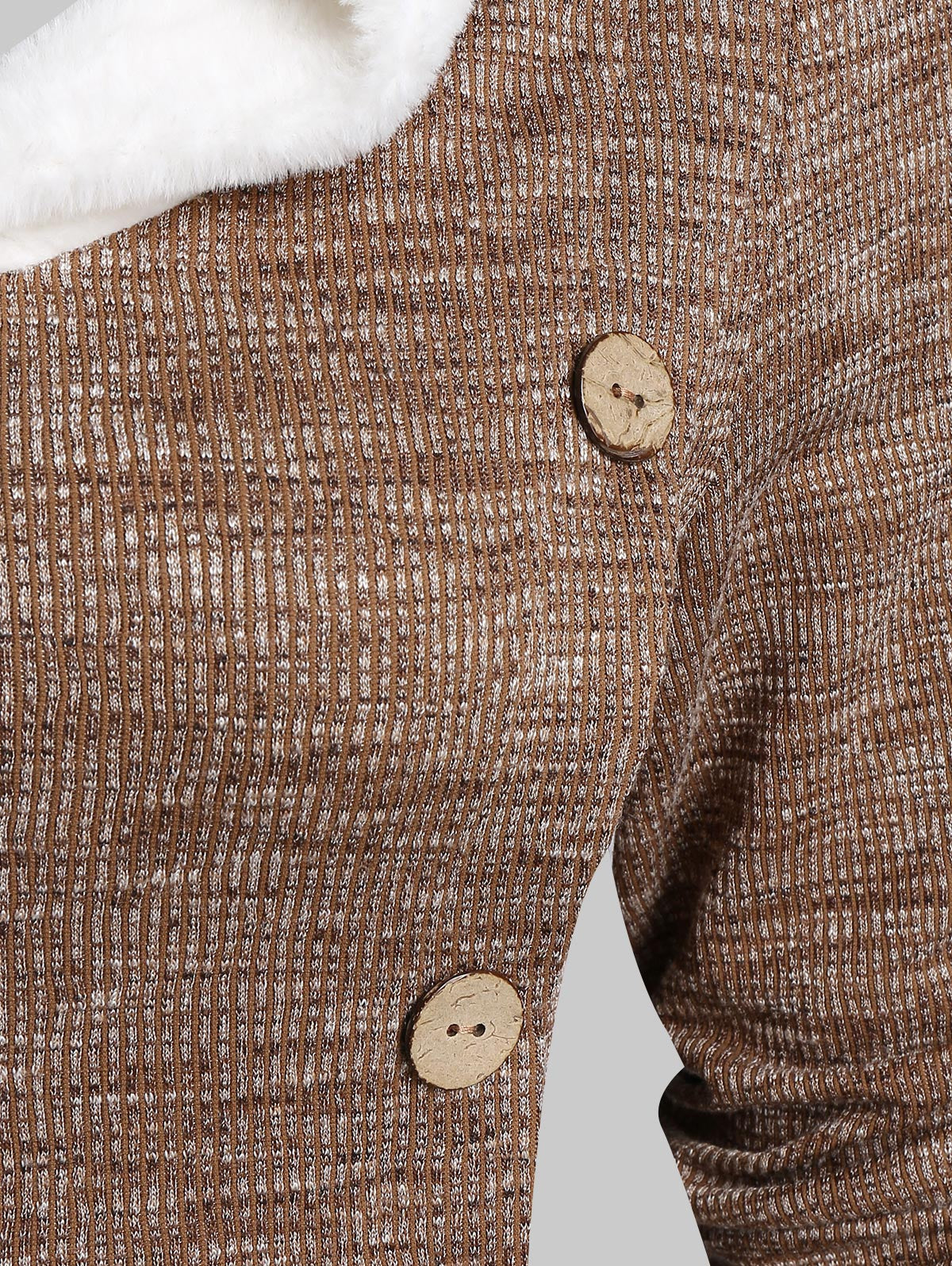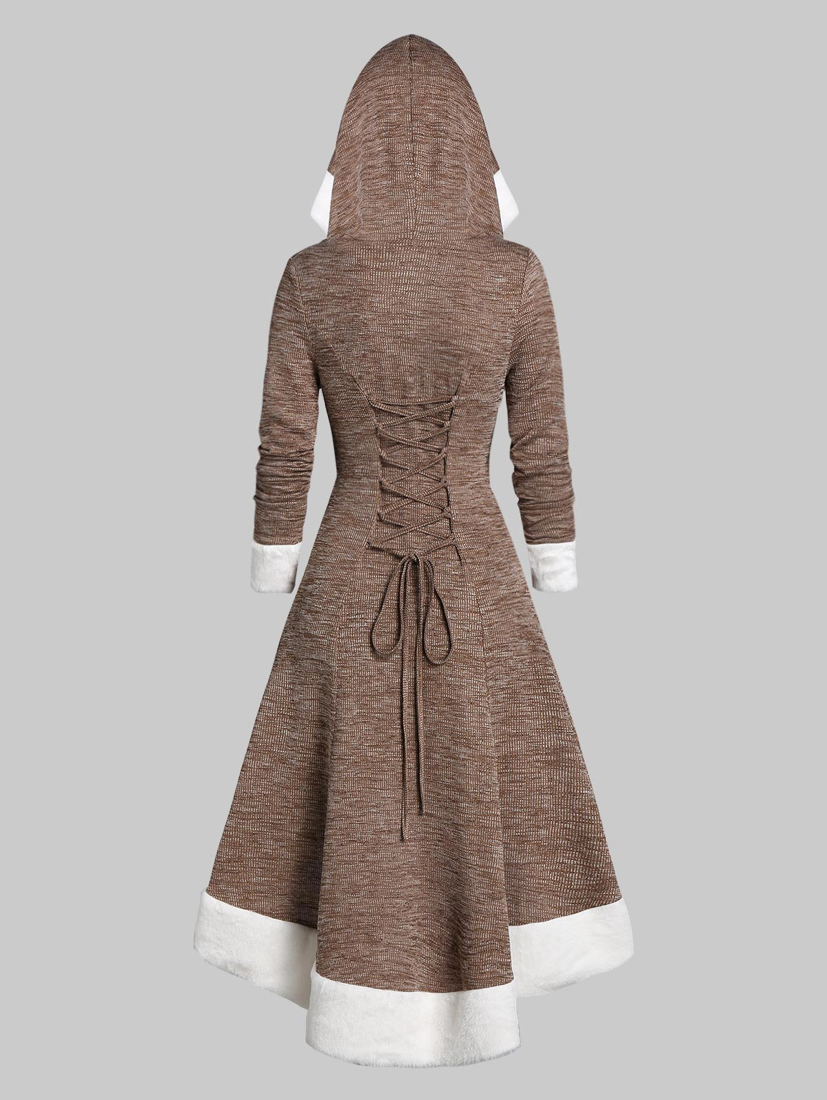 Hooded Faux Fur Trim Mock Button High Low Midi Dress